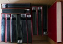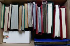 Großer Karton mit 15 Alben mit Schwerpunkt ab den Nachkriegsjahren. Dabei einige Vordrucke aber auch Zusammendrucke und mehr.