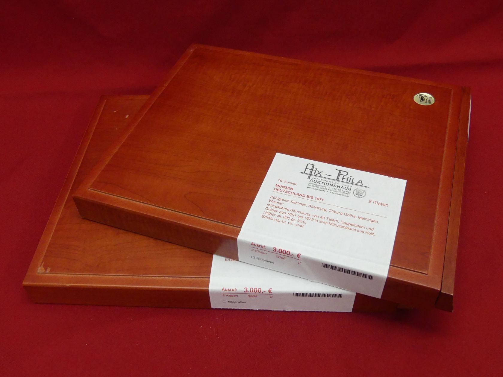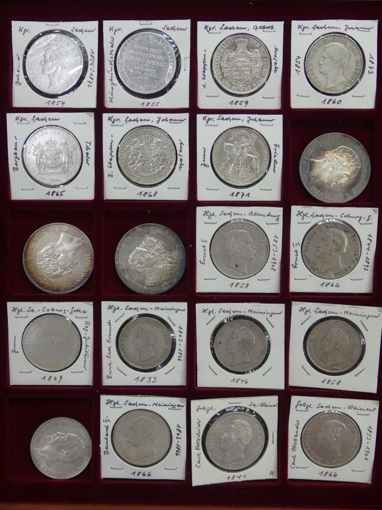 Königreich Sachsen, Altenburg, Coburg-Gotha, Meiningen, Weimar: Interessante Sammlung von 40 Talern, Doppeltalern und Gulden aus 1691 bis 1872 in zwei Münztableaus aus Holz. (Silber ca. 800 g fein), Erhaltung: ss, vz, vz-st