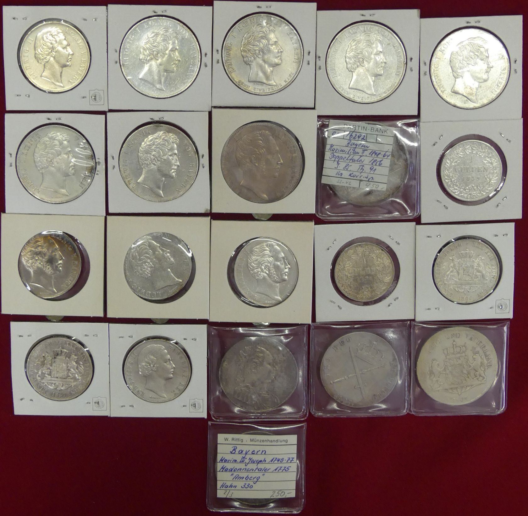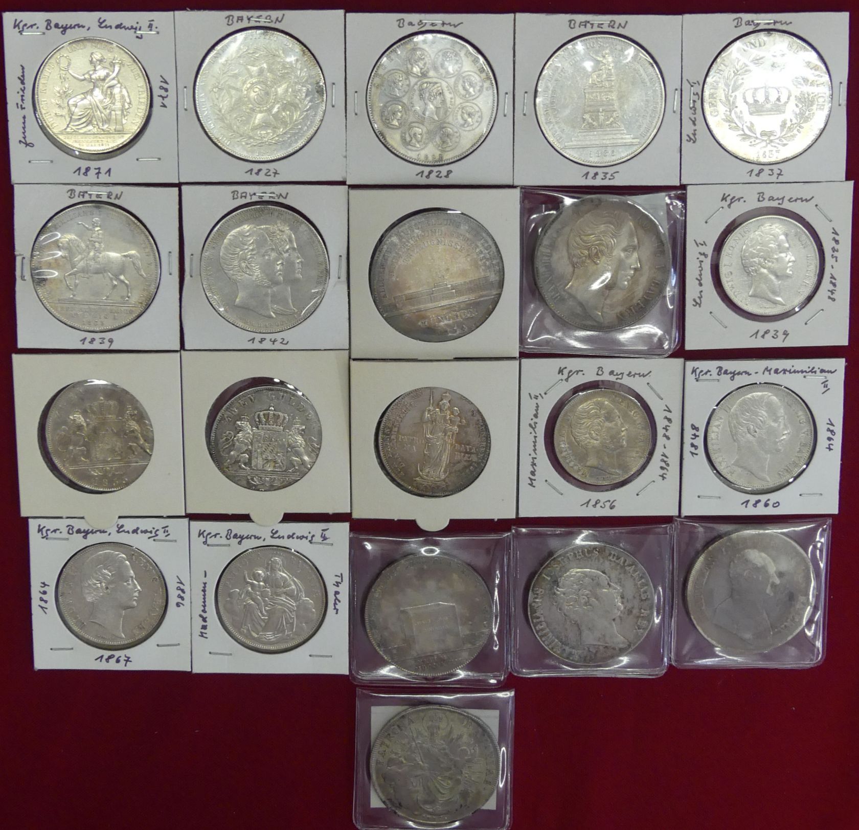 Interessante Sammlung von 21 Talern, Geschichtstalern, Doppeltalern, Gulden und Doppelgulden aus 1775 bis 1871. (Silber ca. 450 g fein)