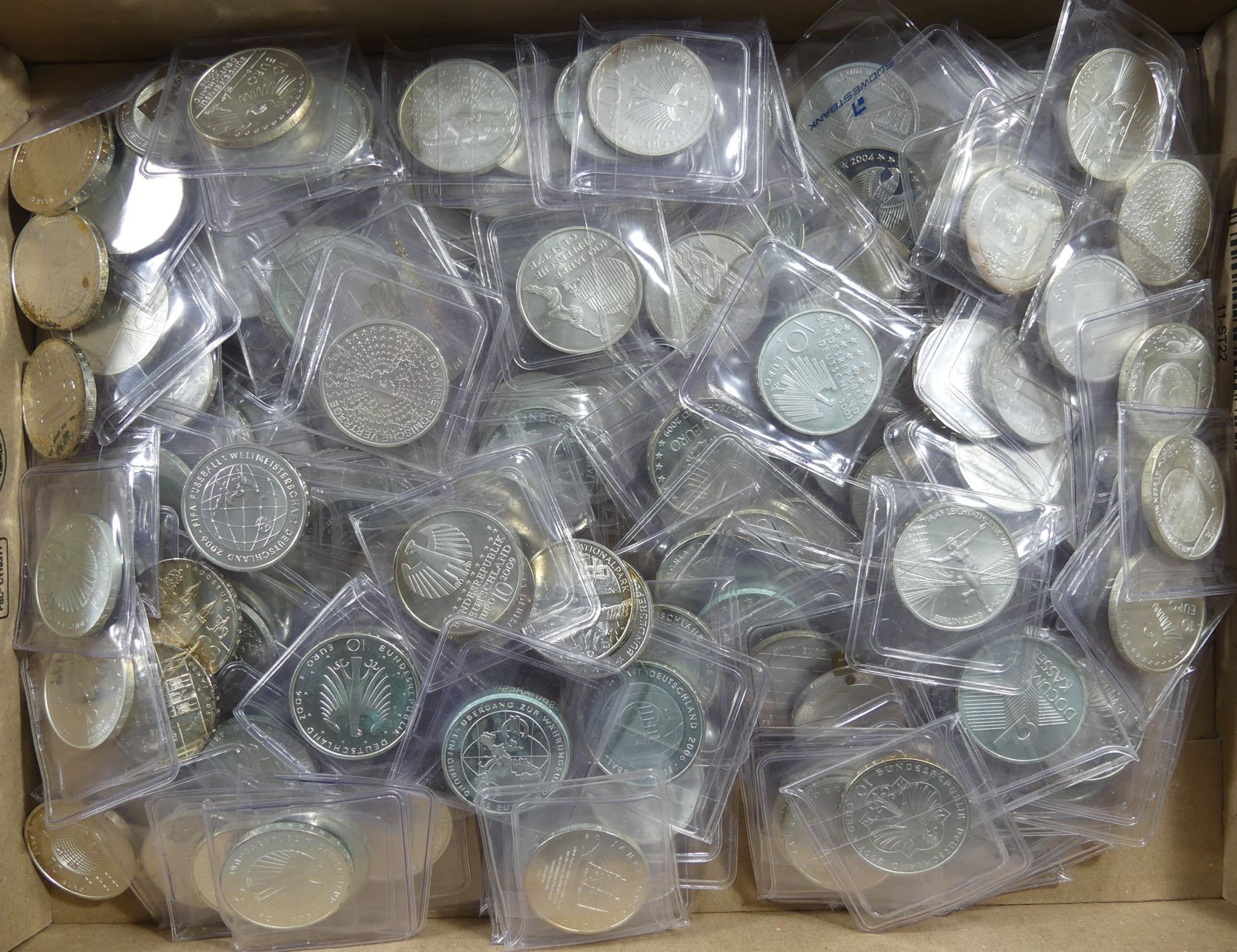 Händlerlos von 10 Euro Gedenkmünzen aus den Jahren 2002-2009, viele mehrfach (Nominale 1.530 Euro, Silber ca. 2.545 g fein). Erhaltung: vz-st