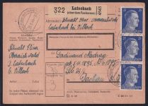 1944, Paketkarte zu einem Paket 3 kg von Latschach (österreichisch-ungarisches Grenzgebiet) nach Dachau. Schutzhäftling Ferdinand Nadrag Gef.-Nr. 61093 Block 24/4.