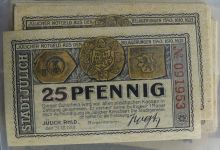 Umfangreiche und vielfältige Sammlung von dreihundert Notgeldscheinen von 25 Pfennig bis 20 Milliarden Mark aus 1917 bis 1923, sehr viele in kassenfrischer Erhaltung. Dazu auch weitere Scheine aus der Umgebung wie z. B. Düren, Linnich etc. Erhaltung: I, II, III
