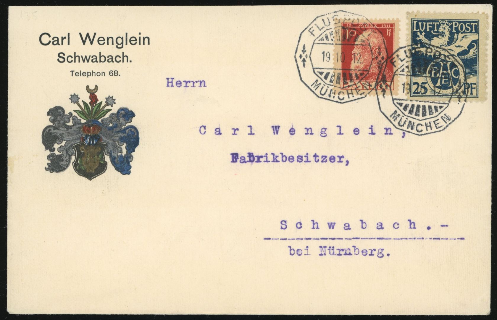 1912, Flugpostmarke auf sauberem Brief mit Zf 10 Pf und achteckigem Flugpoststempel München