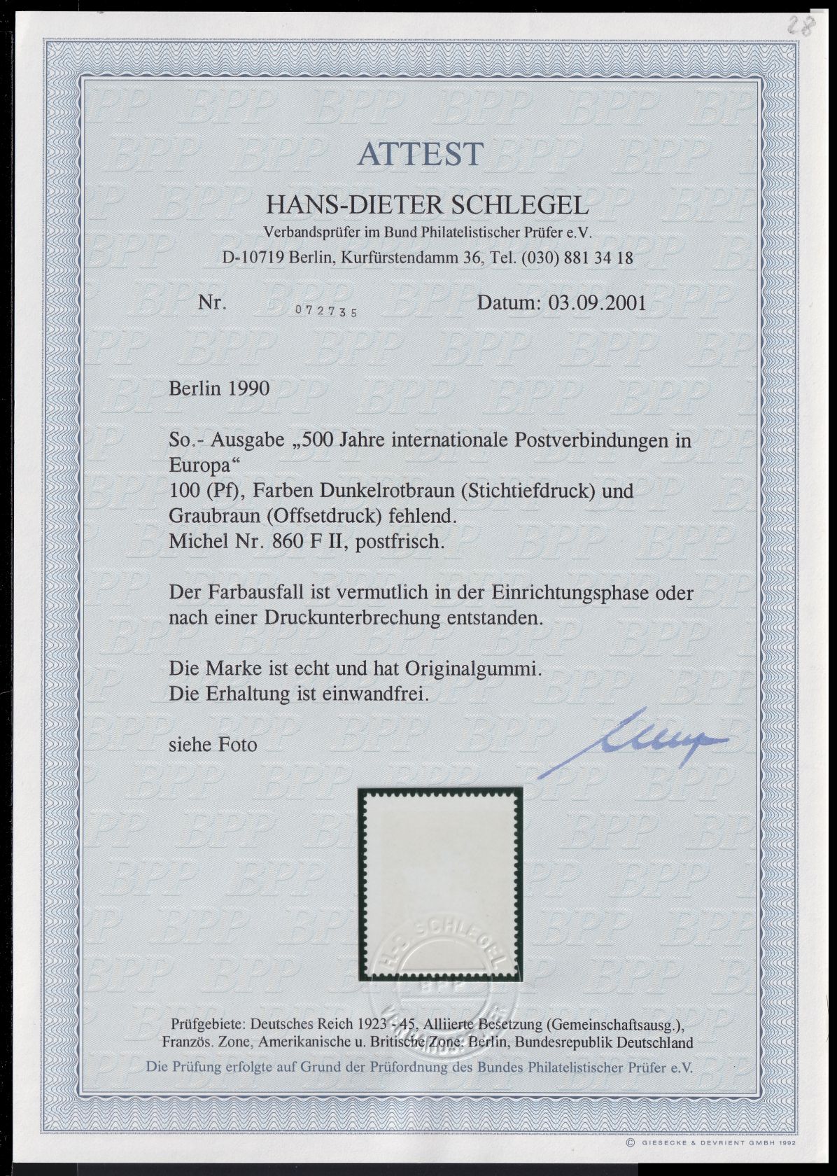 1990, Postreiter mit Farben Dunkelrotbraun und Graubraun fehlend, Fotoattest Schlegel