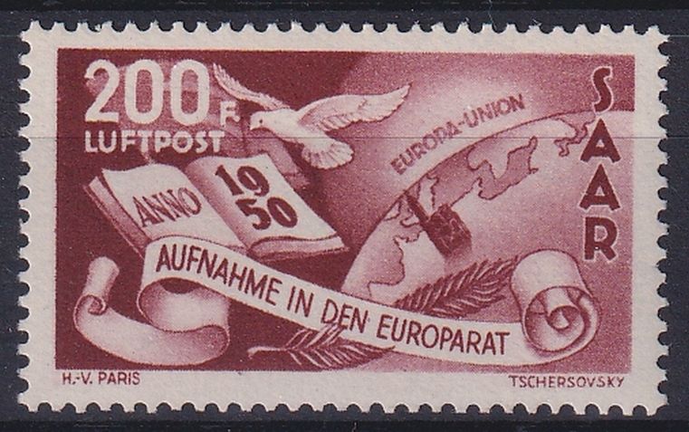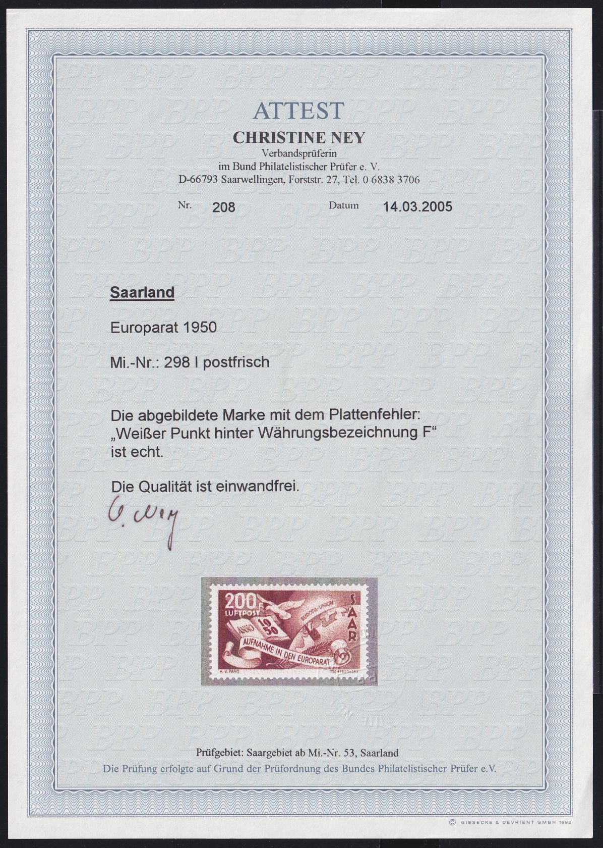 1950, Flugpostmarke 200 Fr mit Plattenfehler weißer Punkt hinter F der Währung, Fotoattest Ney