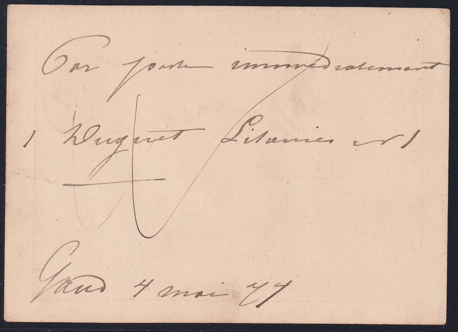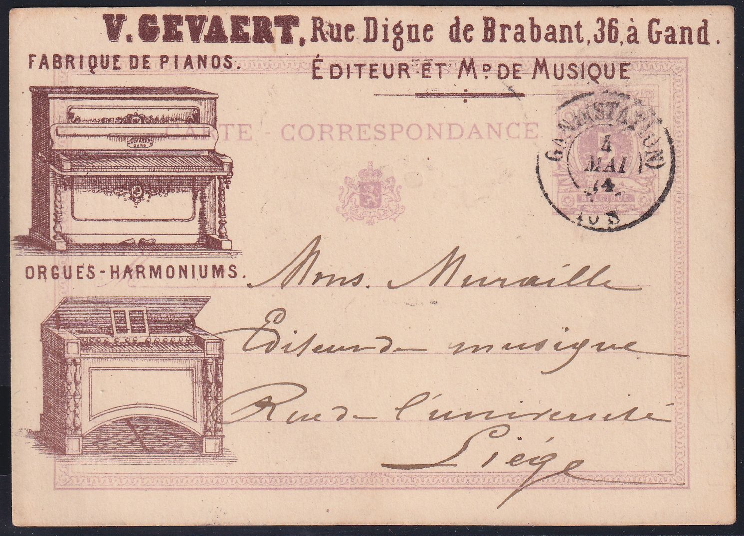 Privat Ganzsache mit Stempel "Gand (Station)" 4.5.1874 mit Illustration 2x Tasteninstrumente V.Gevaert Piano und Harmonium