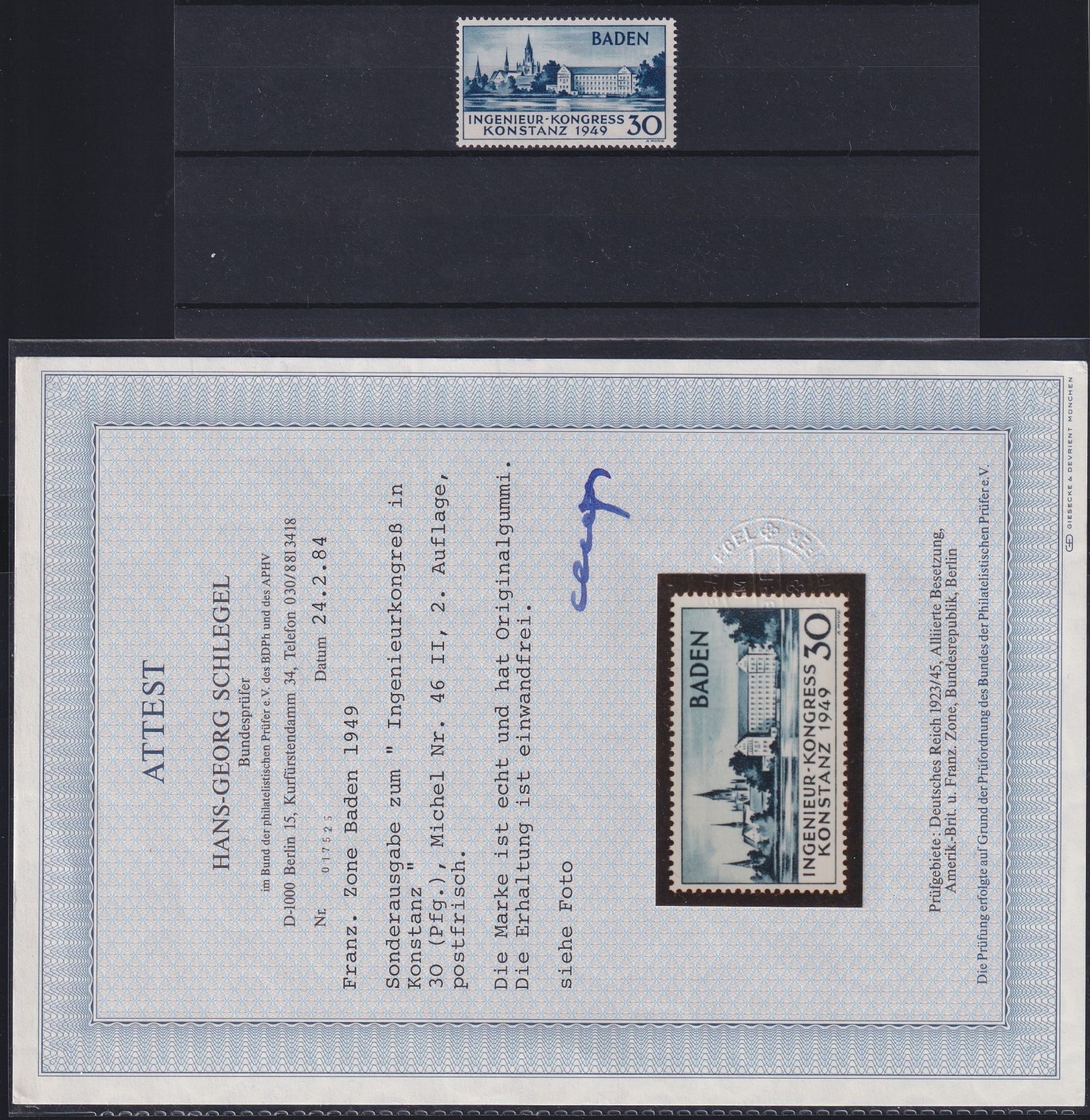 1949, Konstanz II, 2. Auflage mit Fotoattest "einwandfrei" Schlegel