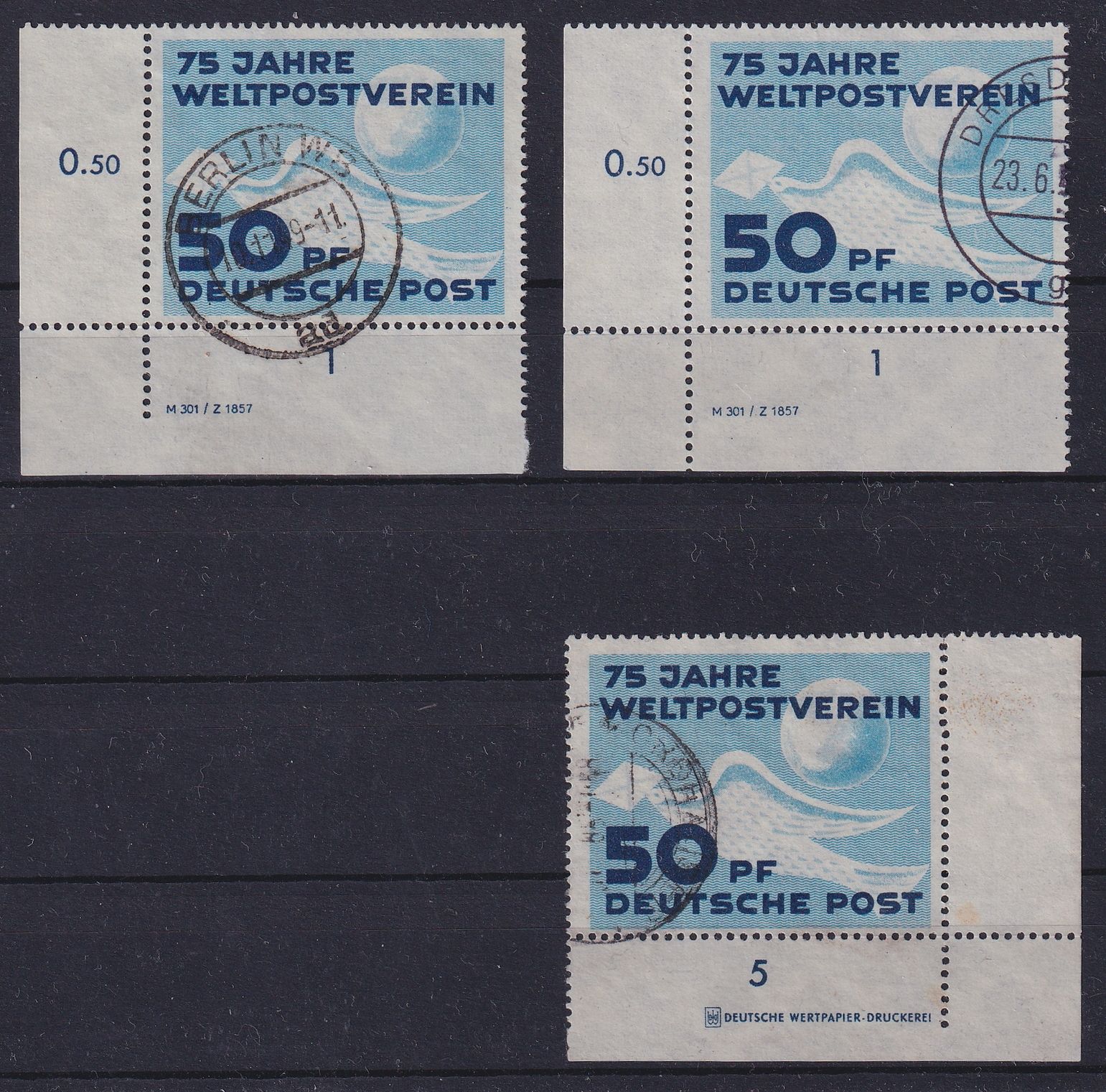 1949, UPU Druckvermerk und Druckereizeichen, DZ mit voll und teilweise durchgezähntem Unterrand