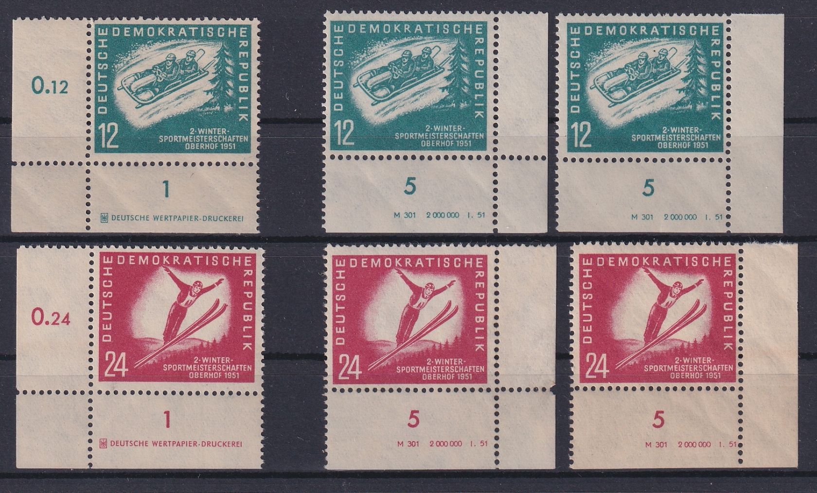 1951, Wintersportmeisterschaften mit Druckvermerk und Druckereizeichen in verschiedenen Zähnungsvarianten