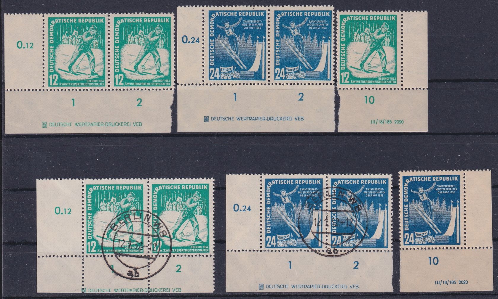 1952, Wintersportmeisterschaften mit Druckvermerk und Druckereizeichen in verschiedenen Zähnungsvarianten