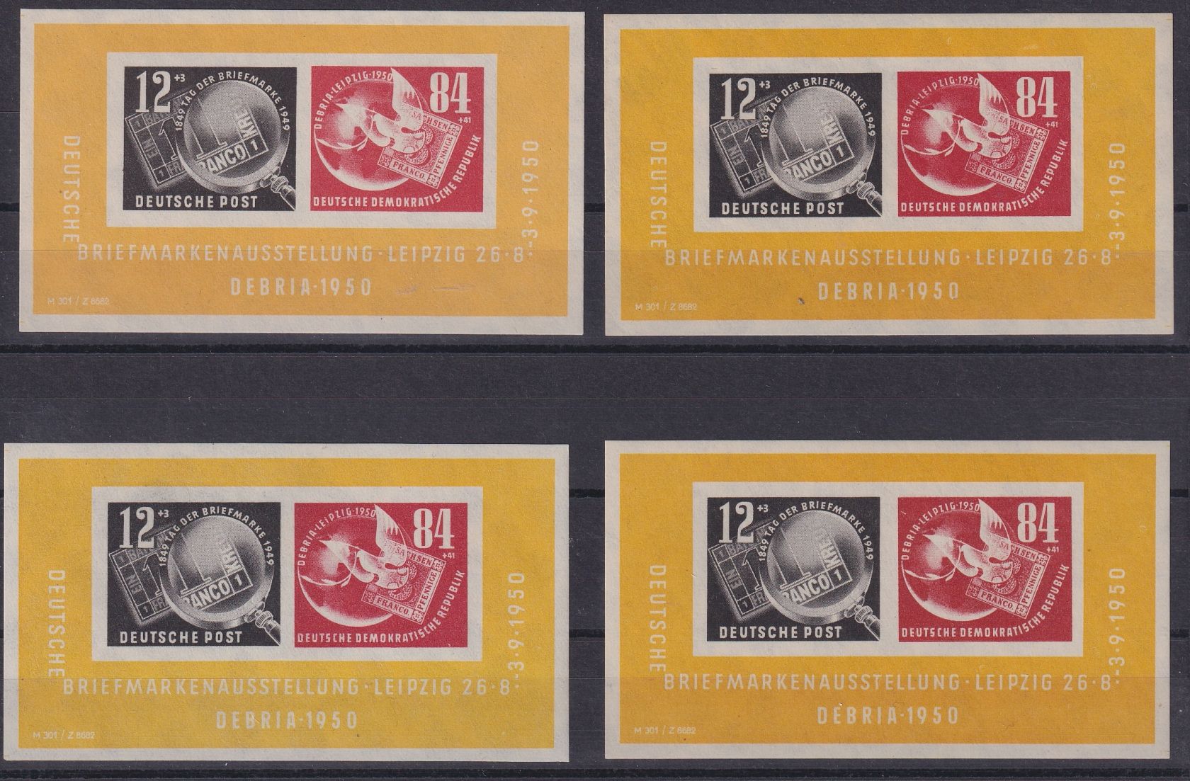 1950, Debria-Block mit unterschiedlichen Schnittmarkierungen laut Michel Spezial Blocks und Kleinbögen