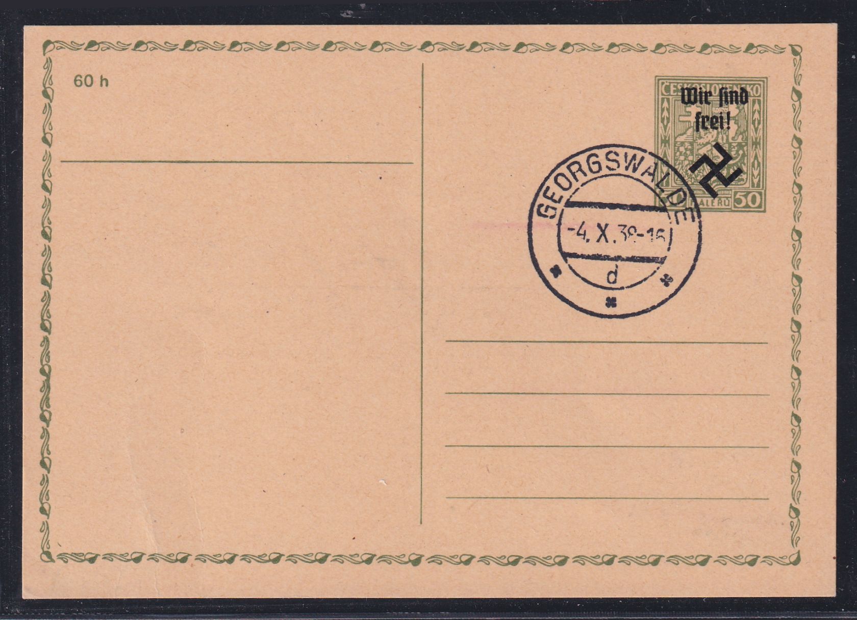 1938, Ganzsache mit spiegelverkehrtem Hakenkreuz. Geprüft Mahr GPP