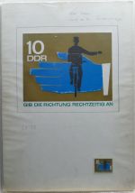 1966, Sicherheit im Straßenverkehr 25 Pf, handgemalter Entwurf, noch in der Wertstufe zu 10 Pf, auf Karton mit zusätzlichem handgemaltem Entwurf im Briefmarkenformat, mit rückseitigem Adress-Stempel "Manfred Gottschall", Format 21:29,5cm