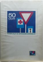 1966, Sicherheit im Straßenverkehr 50 Pf, handgemalter Entwurf, noch in der Wertstufe zu 15 Pf, auf Karton mit zusätzlichem handgemaltem Entwurf im Briefmarkenformat, mit rückseitigem Adress-Stempel "Manfred Gottschall", Format 21:29,5cm