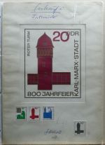 1965, 800 Jahre Chemnitz 20 Pf, handgemalter Entwurf im Passepartout, auf Karton, mit Originalunterschrift des Entwerfers und rückseitigem Adress-Stempel "Manfred Gottschall", Format 21:29,5cm