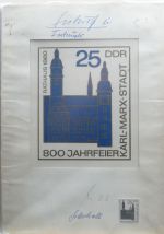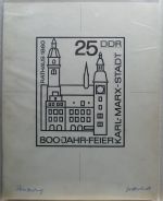 1965, 800 Jahre Chemnitz 25 Pf, handgemalter Entwurf auf Karton, Reinzeichnung, mit Originalunterschrift des Entwerfers und rückseitigem Adress-Stempel "Manfred Gottschall", Format 21:29,5cm