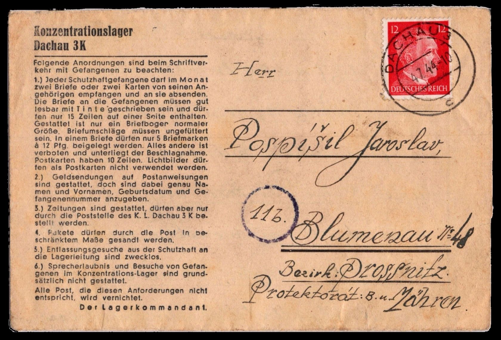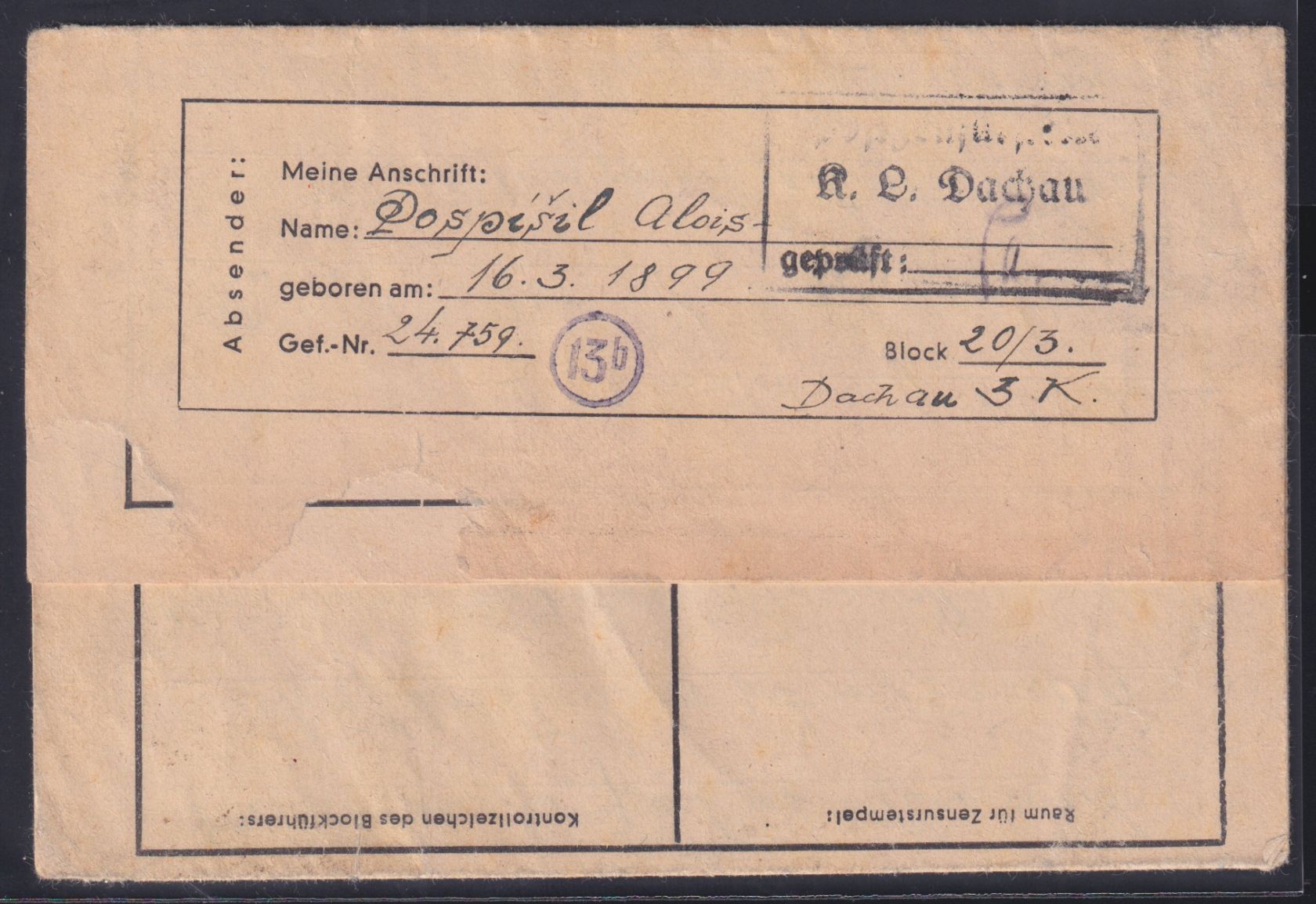 1944, Faltbrief mit Anordnung bei Schriftverkehr und Zensurstempel "Dachau". Schutzhäftling Alois Pospisil Gef.-Nr. 24759 Block 20/3. Ist bereits 52 Monate verhaftet und hat sich verlobt.