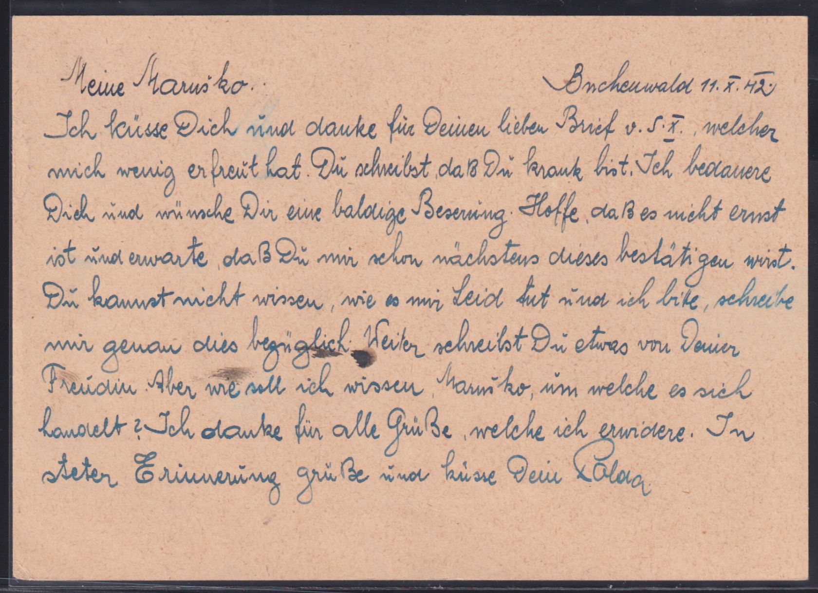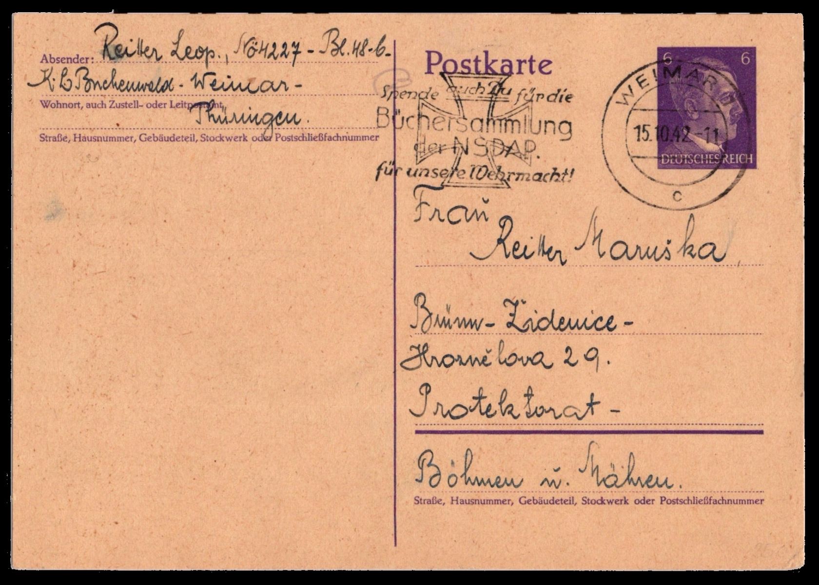 1942, Postkarte des Gefangenen Leopold Reitter Gef.-Nr. 4227 Block 48/C. Karte mit Sorge um die Krankheit seiner Frau. Postkarte ist selten aus dem KZ.