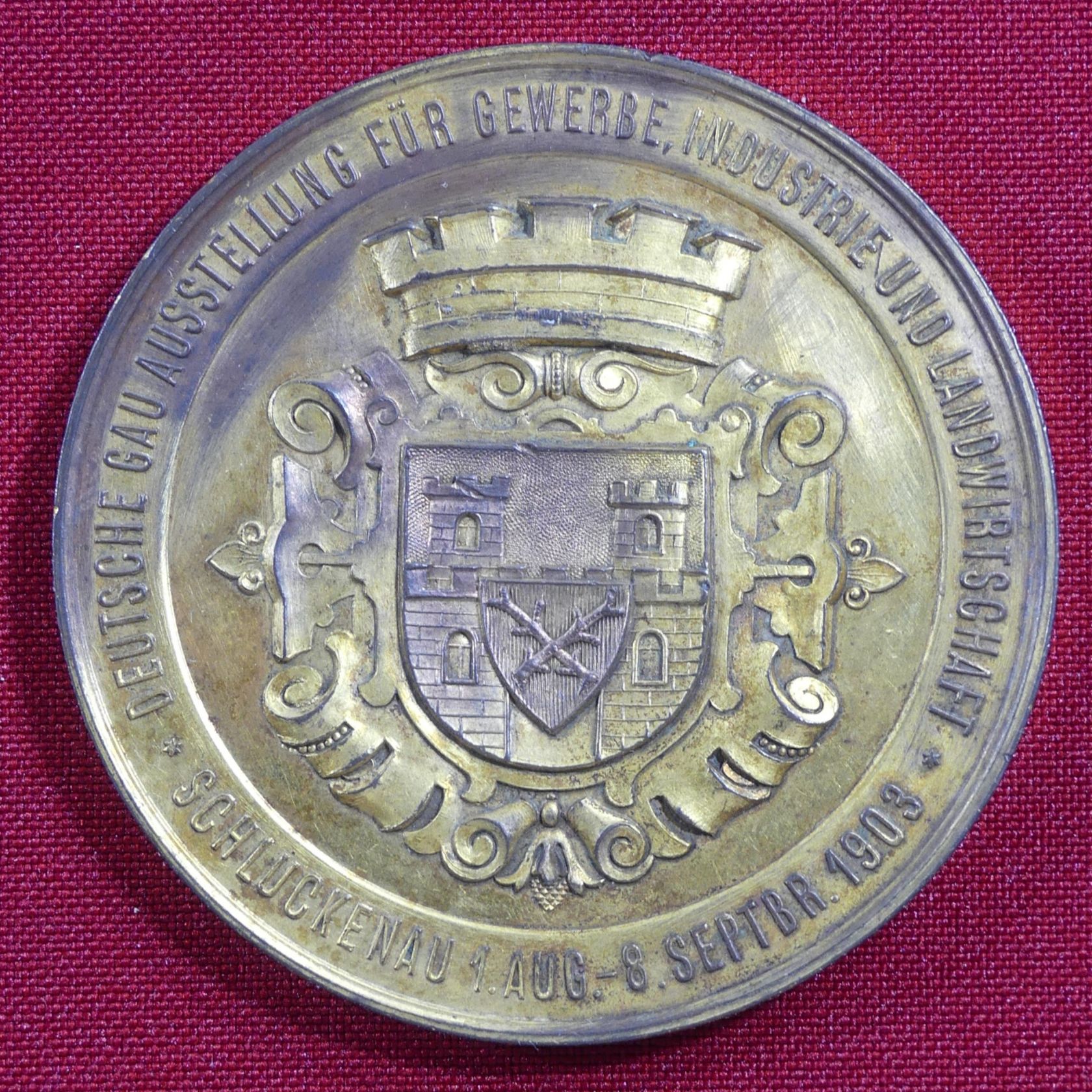 Sudetenland, vergoldete Bronze-Verdienstmedaille, Deutsche Gau-Ausstellung für Gewerbe, Industrie und Landwirtschaft, Schluckenau 1. Aug. bis 8. Sept. 1903, 61 mm