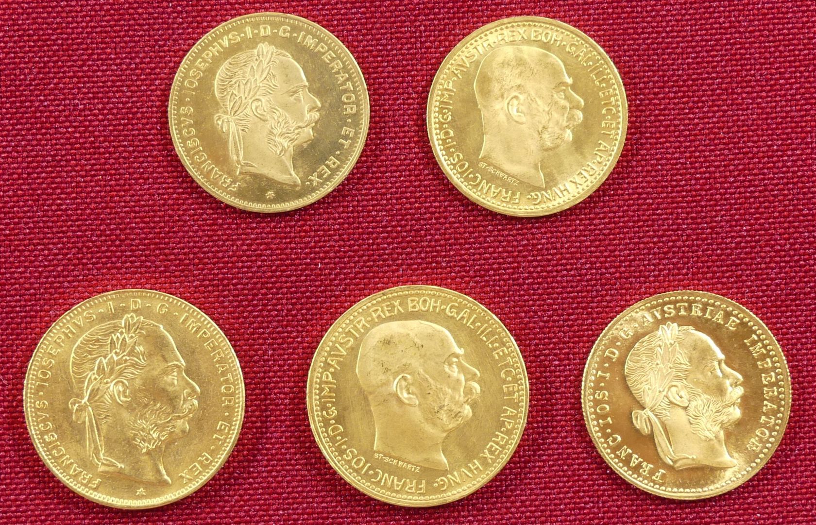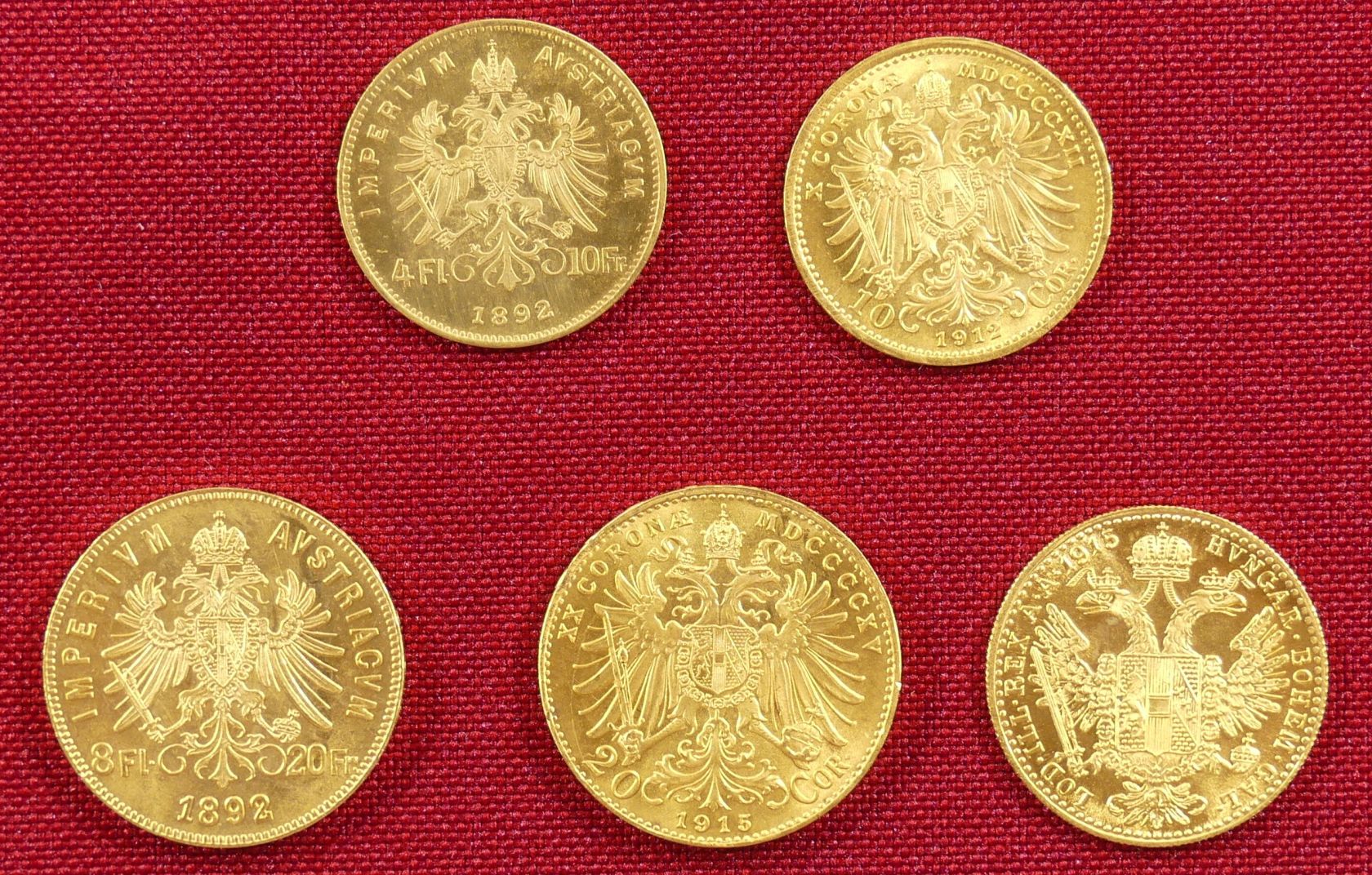 Posten von 5 Münzen zu 10 Kronen 1912, 20 Kronen 1915, 4 und 8 Florin 1892 und 1 Dukat 1915, offizielle Nachprägungen (Gold 21,30 g fein).