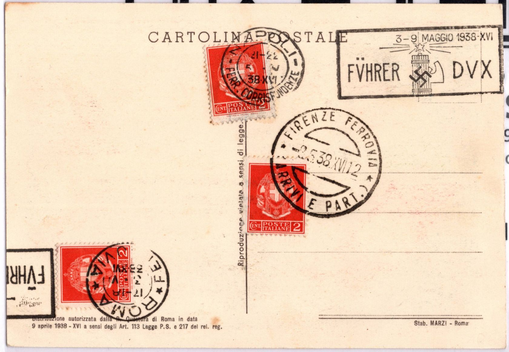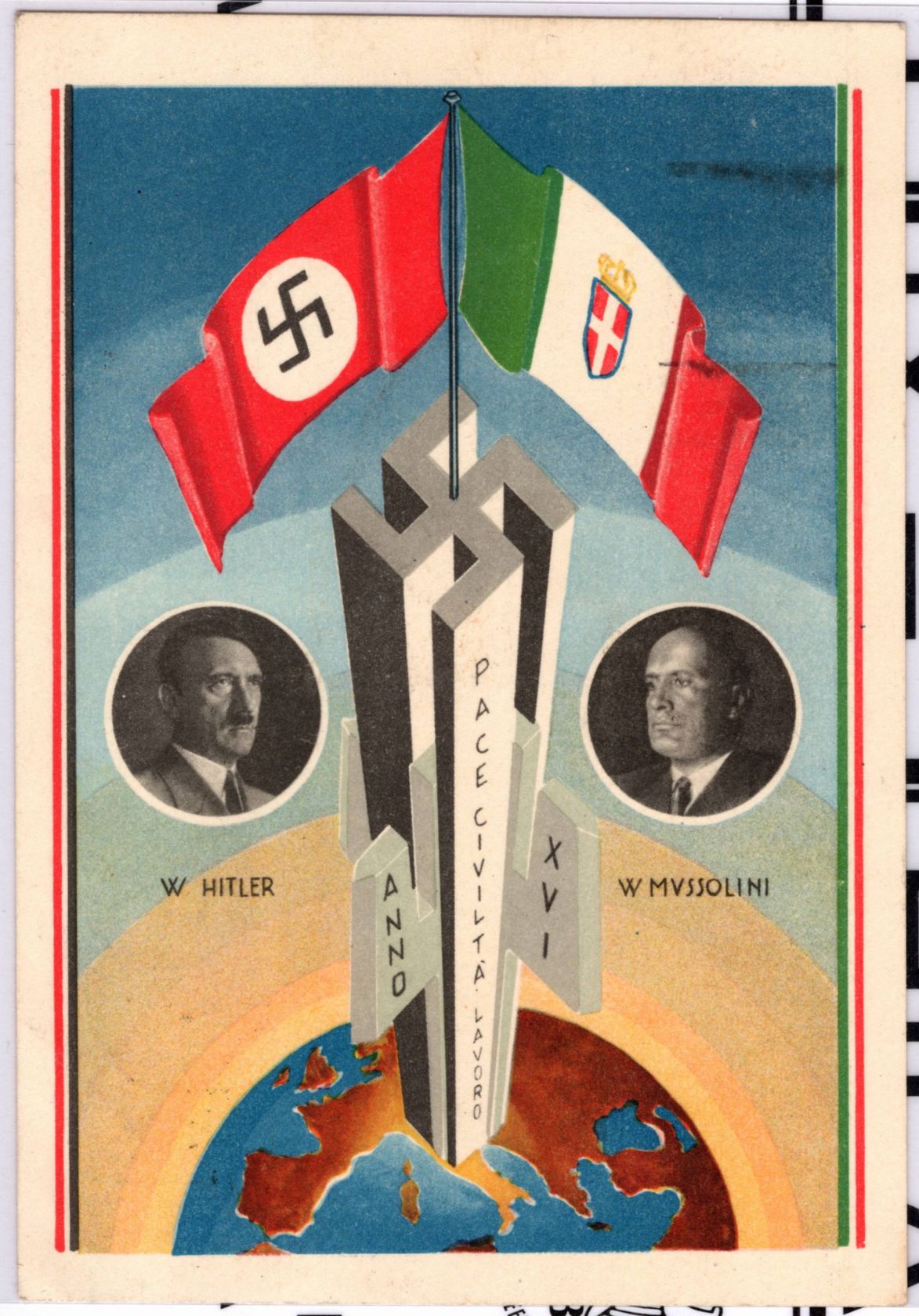 1938, Propagandakarte Hitler Mussolini, philatelistisch gebraucht