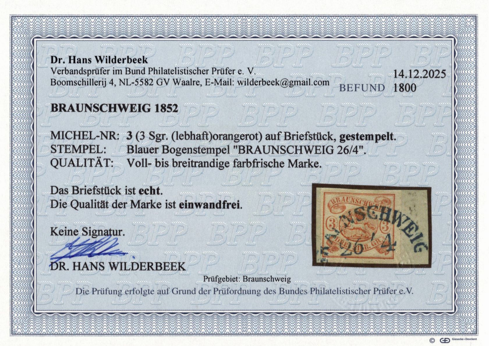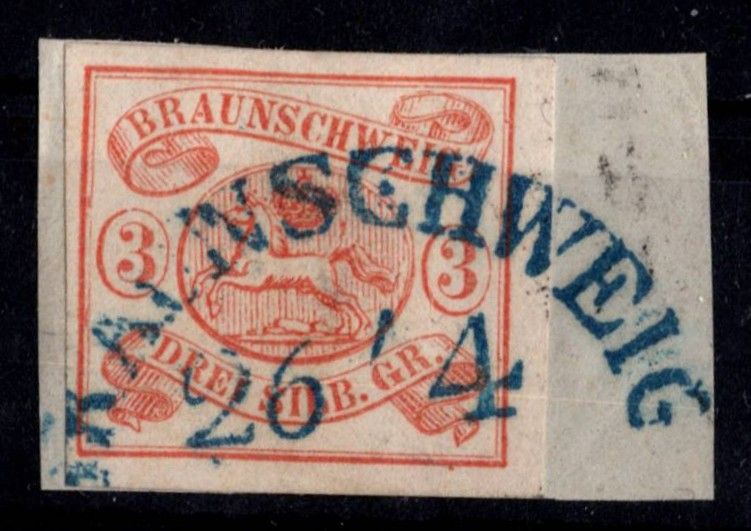 1852, Freimarke 3 Sgr auf Briefstück mit blauem Bogenstempel "BRAUNSCHWEIG 26/4", voll- bis breitrandige farbfrische Marke, Fotobefund Wilderbeek BPP "einwandfrei"