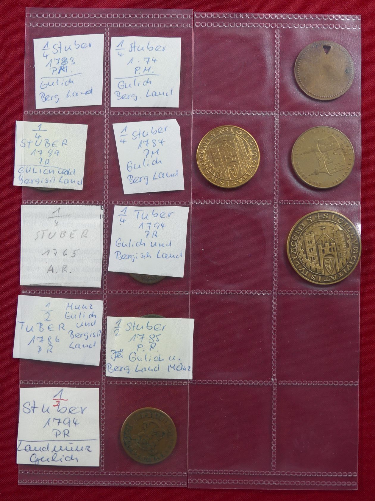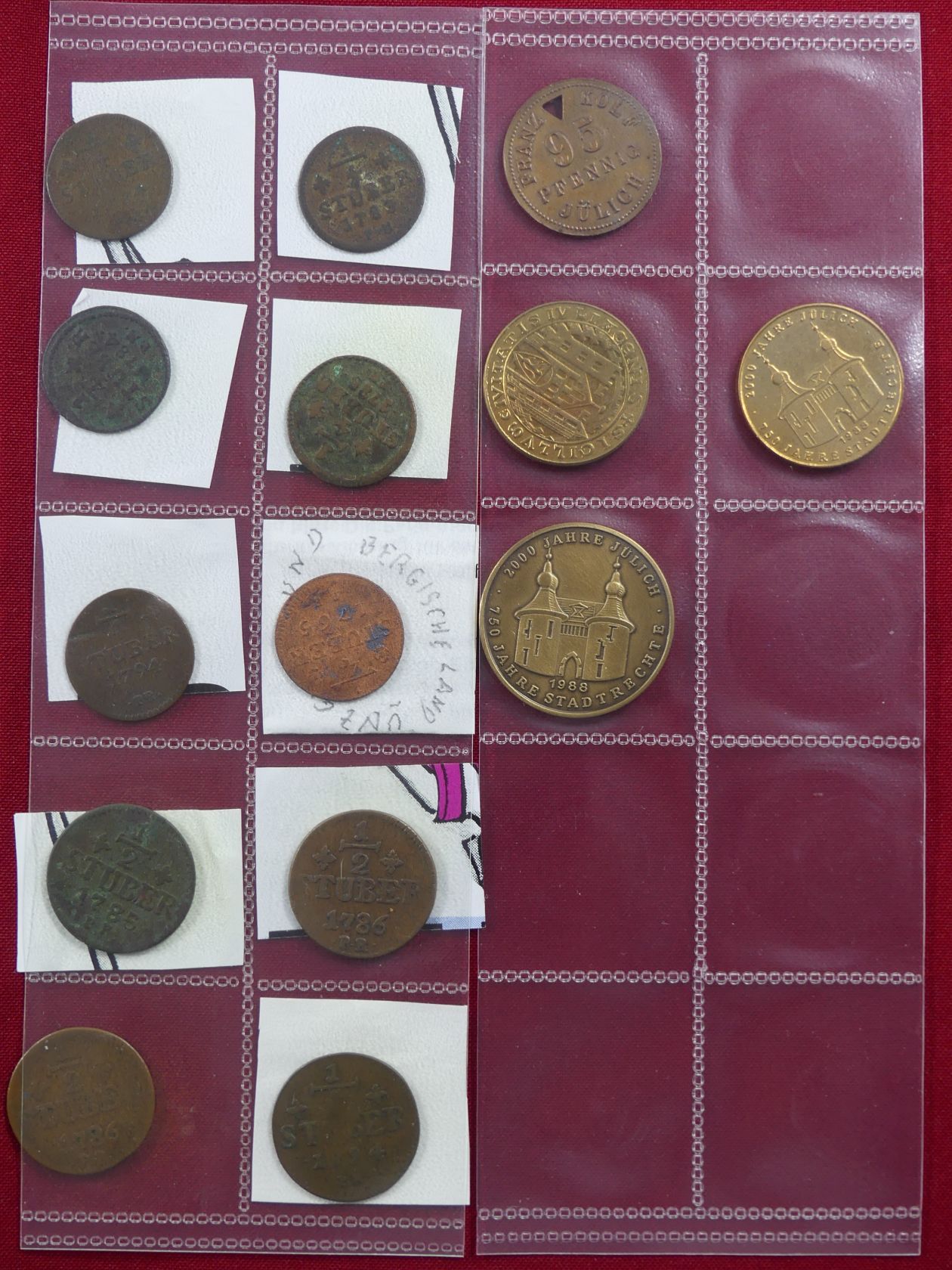 Kleine Sammlung von 10 Kupfermünzen zu 1/4 und 1/2 Stüber aus 1764 bis 1794, dazu Jülich 3 moderne Medaillen und Firmennotgeld zu 95 Pfennig Franz Kolf.