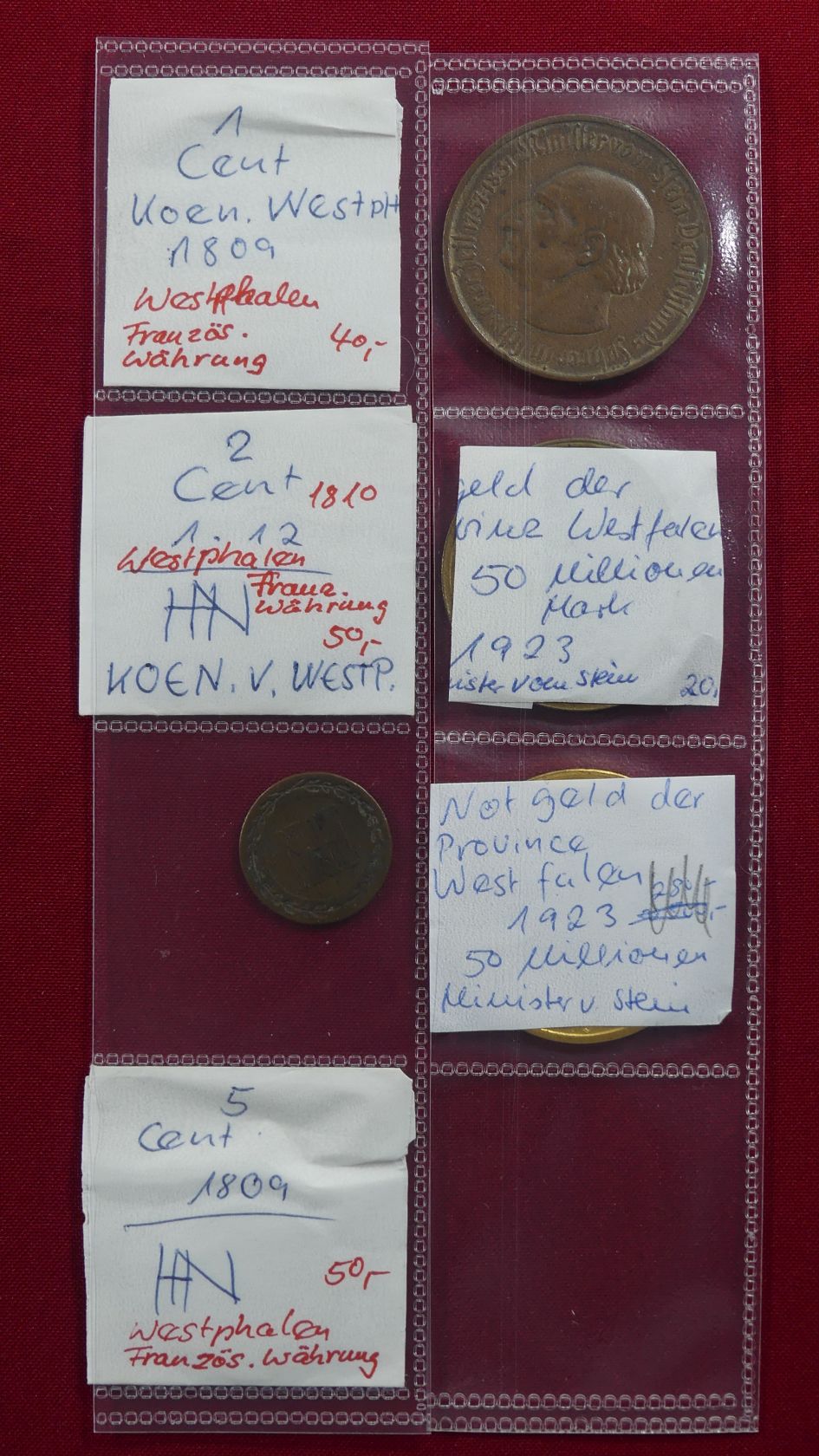 Königreich Westfalen und Notgeld der Provinz Westfalen: Kleine Sammlung von 5 Kupfermünzen zu 1, 2, 3 und 5 Cent 1809/10, dazu 3 Notgeldmünzen zu 5 und 50 Millionen Mark 1923.