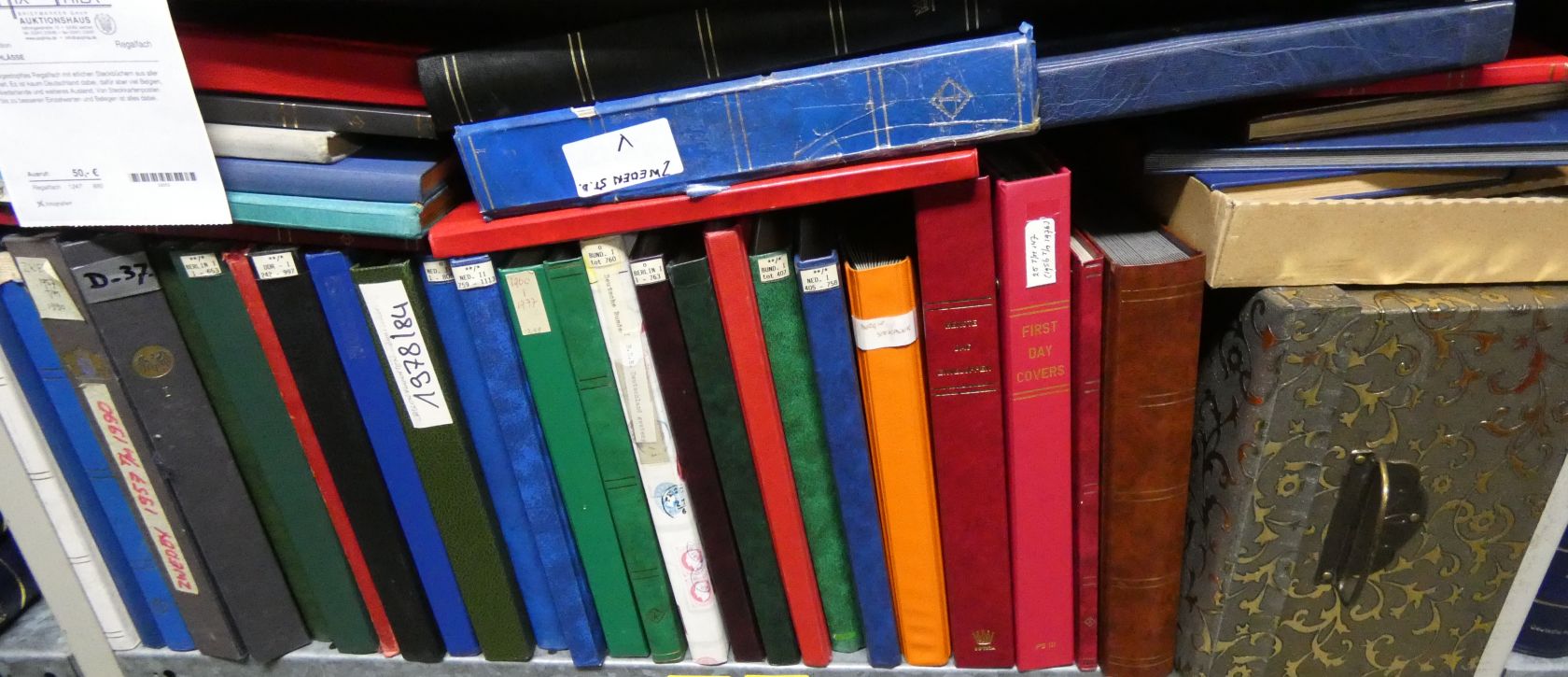 Vollgestopftes Regalfach mit etlichen Steckbüchern aus aller Welt. Es ist kaum Deutschland dabei, dafür aber viel Belgien, die Niederlande und weiteres Ausland. Von Steckkartenposten bis zu besseren Einzelwerten und Belegen ist alles dabei.
