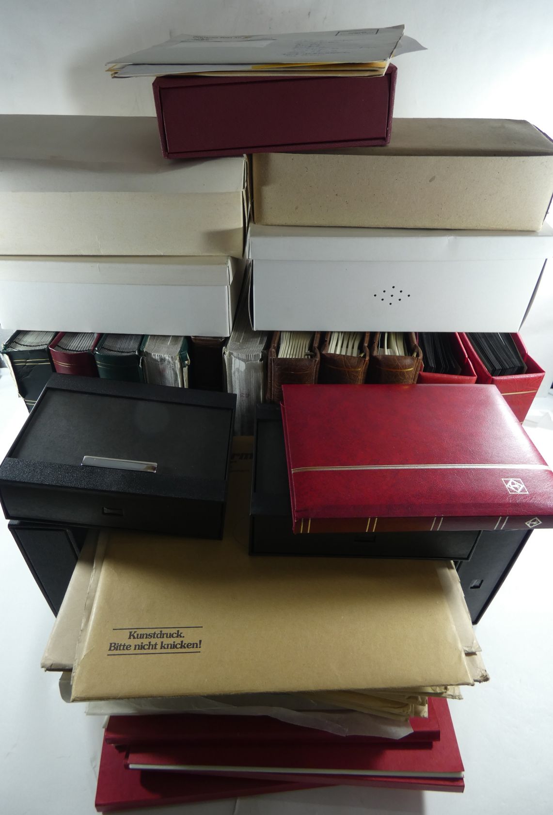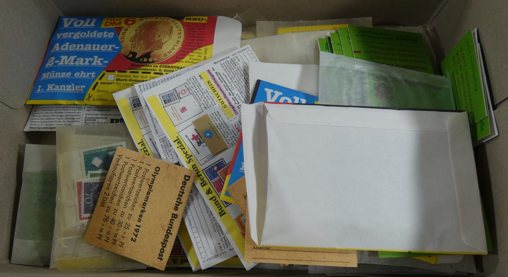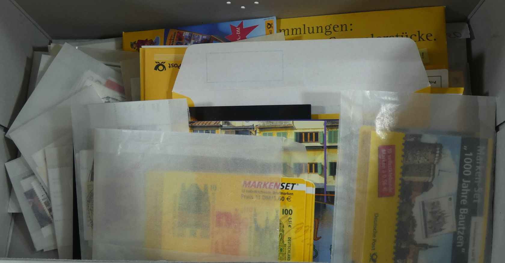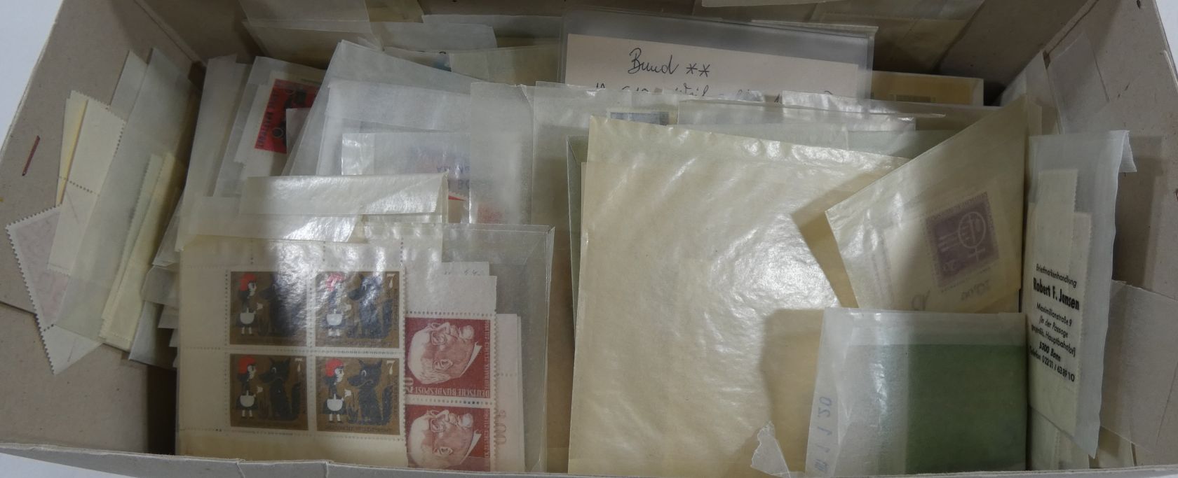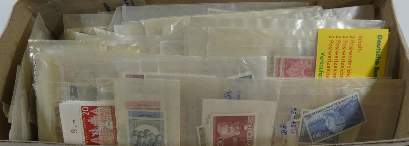 Umfangreicher Sammlernachlass im Regalfach. Dabei ca. 13 Jahre Frankaturware mit etlichen Extras wie MH usw. Unmengen an Bögen und Teilbögen, leider alles aus der DM-Zeit. Dabei sind aber auch viele Dauerserien mit FN usw. Ebenfalls enthalten sind zwei Kisten mit Tütchenware, wobei diese qualitativ top zu sein scheint und auch immer wieder bessere Anfangsware Bund und Berlin gesehen wurde. Zuletzt sind auch noch einige Steckbücher mit recht modernen Ausgaben aus aller Welt, die weitestgehend auch noch Frankaturwert haben.