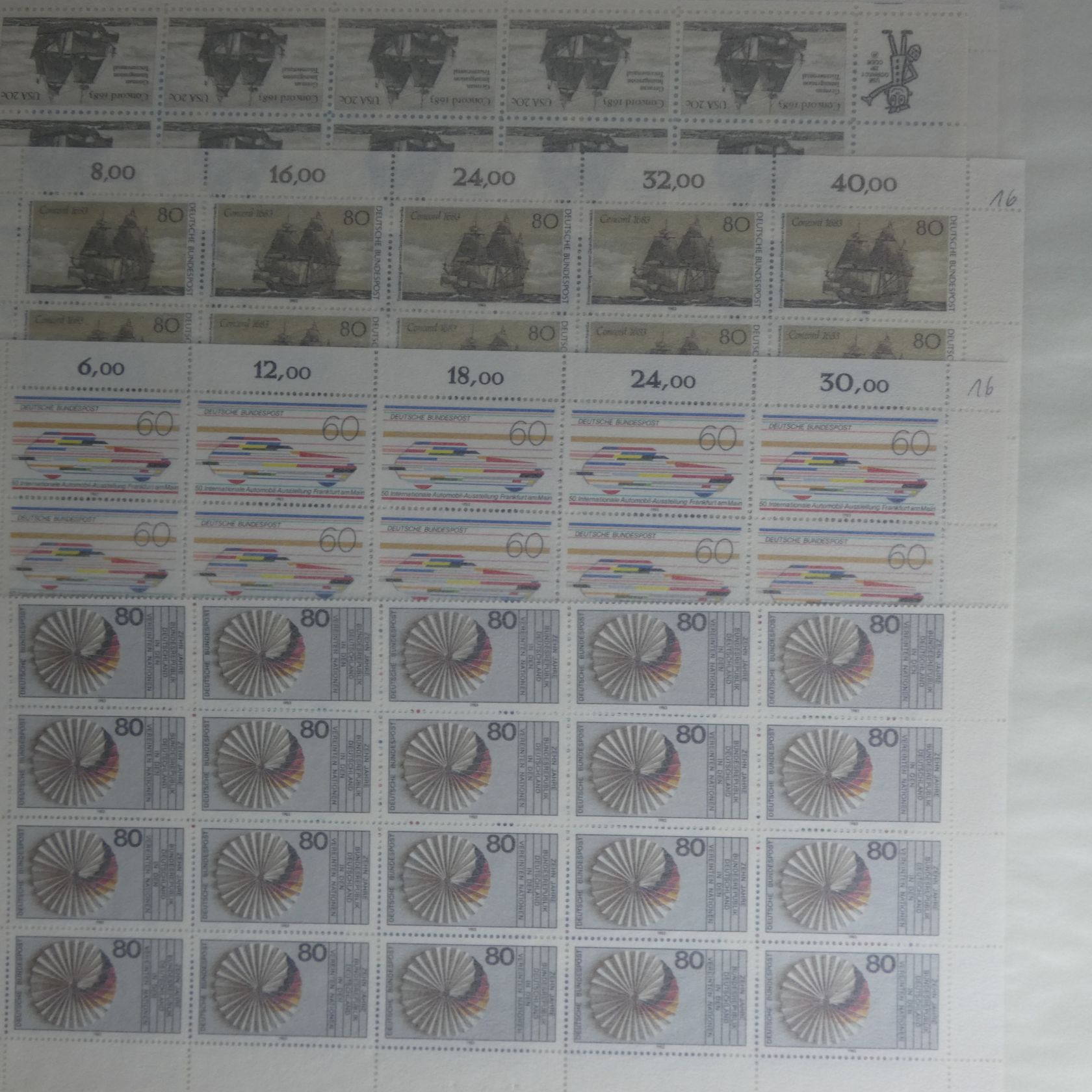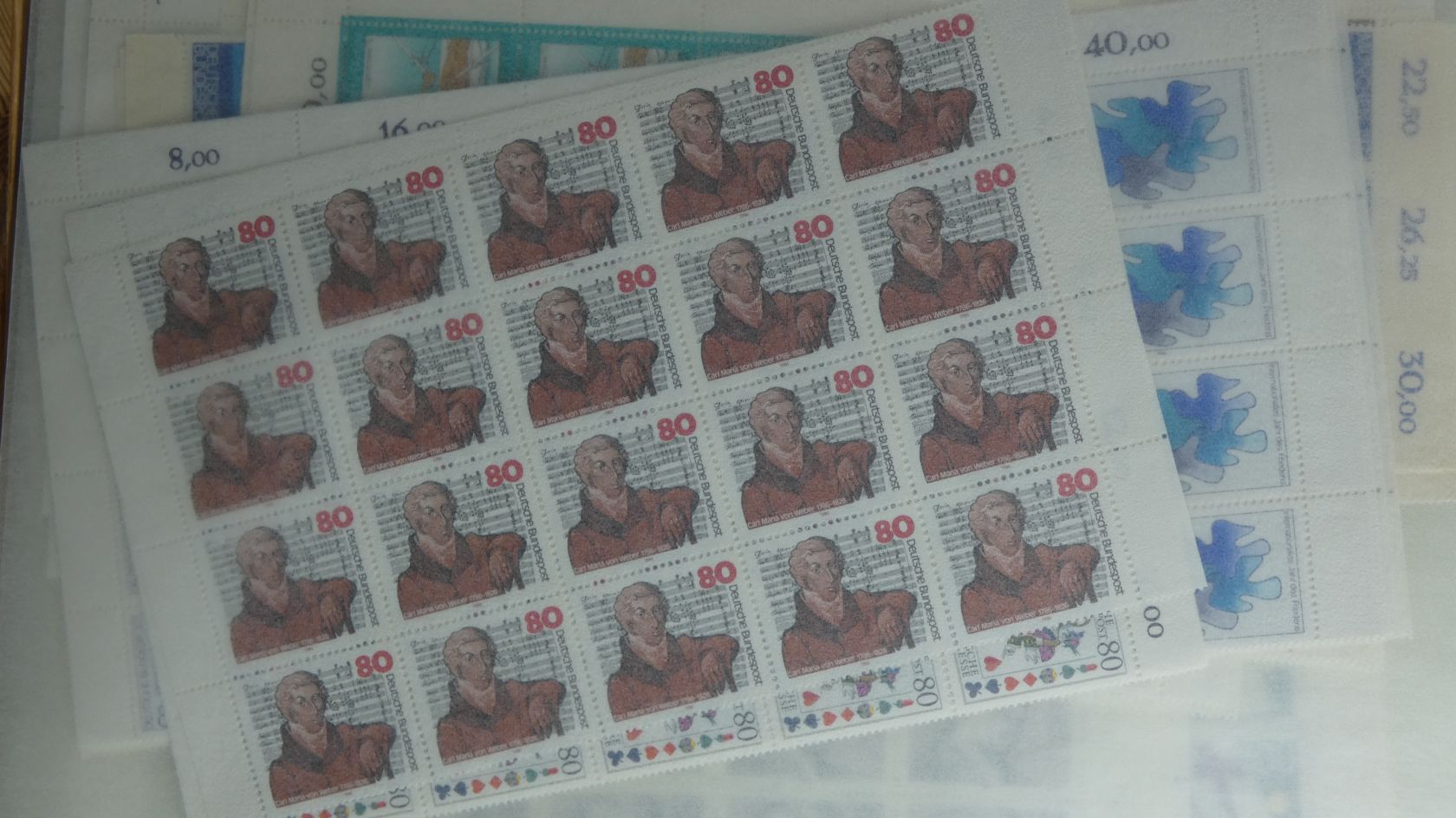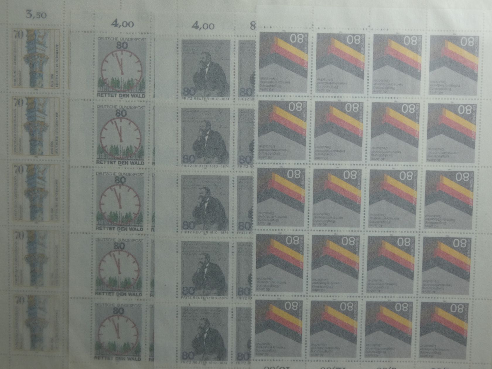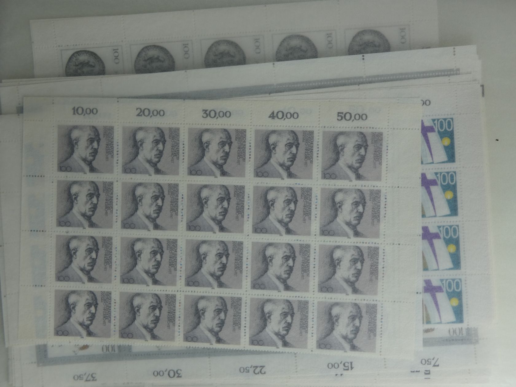 Umfangreicher Sammlernachlass im Regalfach. Dabei ca. 13 Jahre Frankaturware mit etlichen Extras wie MH usw. Unmengen an Bögen und Teilbögen, leider alles aus der DM-Zeit. Dabei sind aber auch viele Dauerserien mit FN usw. Ebenfalls enthalten sind zwei Kisten mit Tütchenware, wobei diese qualitativ top zu sein scheint und auch immer wieder bessere Anfangsware Bund und Berlin gesehen wurde. Zuletzt sind auch noch einige Steckbücher mit recht modernen Ausgaben aus aller Welt, die weitestgehend auch noch Frankaturwert haben.