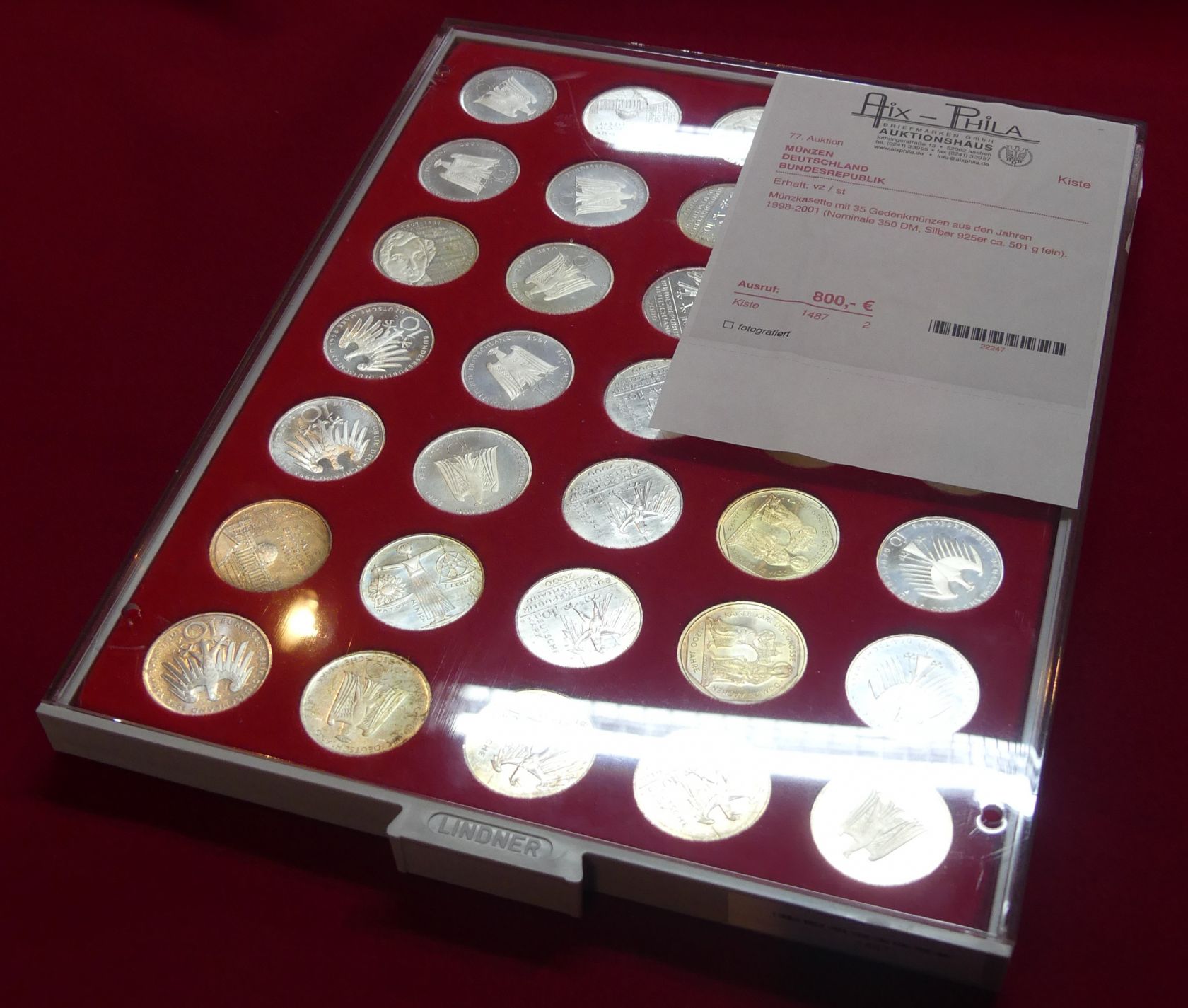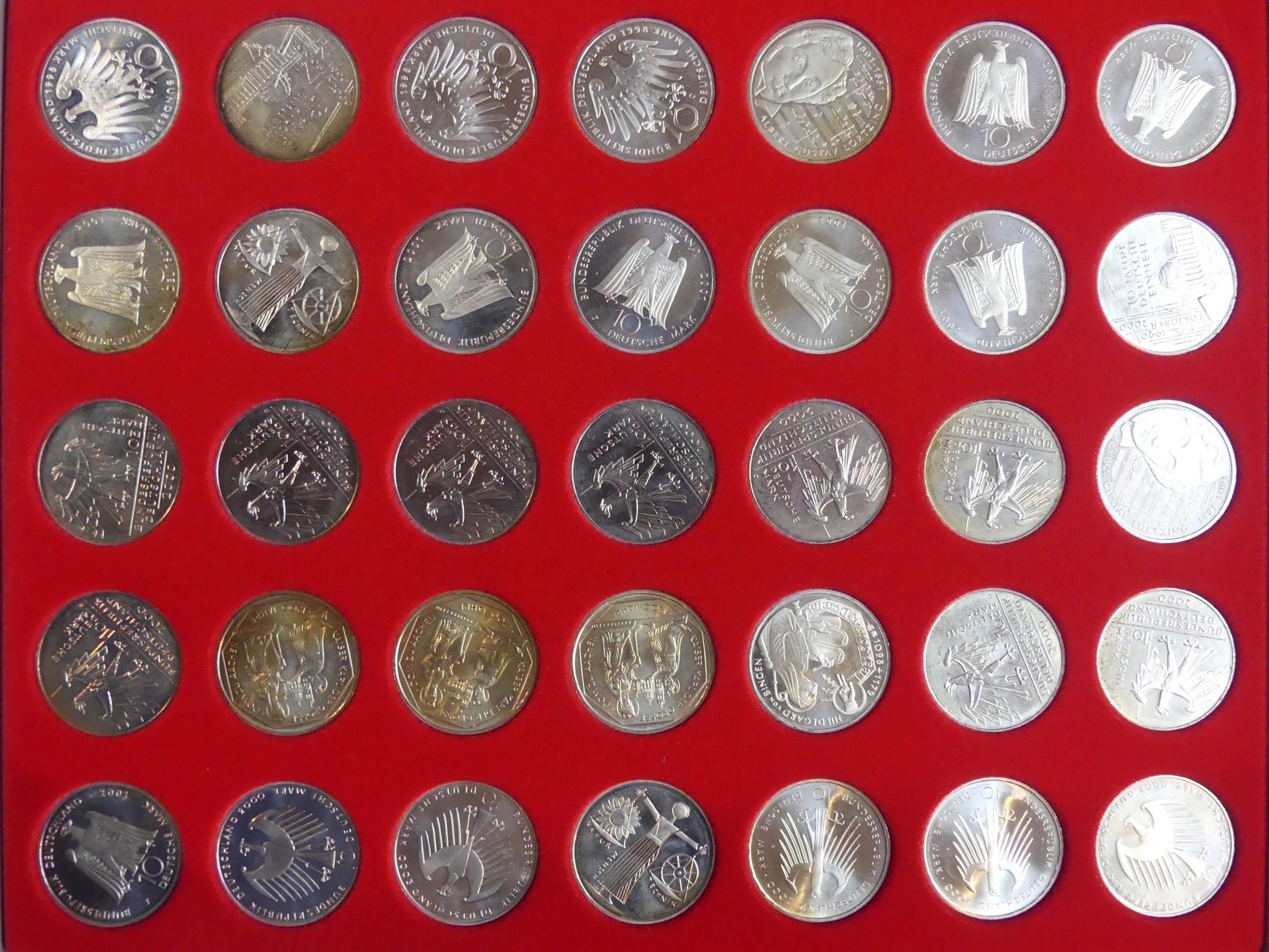 Münzkassette mit 35 Gedenkmünzen 10 DM aus den Jahren 1998-2001 (Nominale 350 DM, Silber 925er ca. 501 g fein).