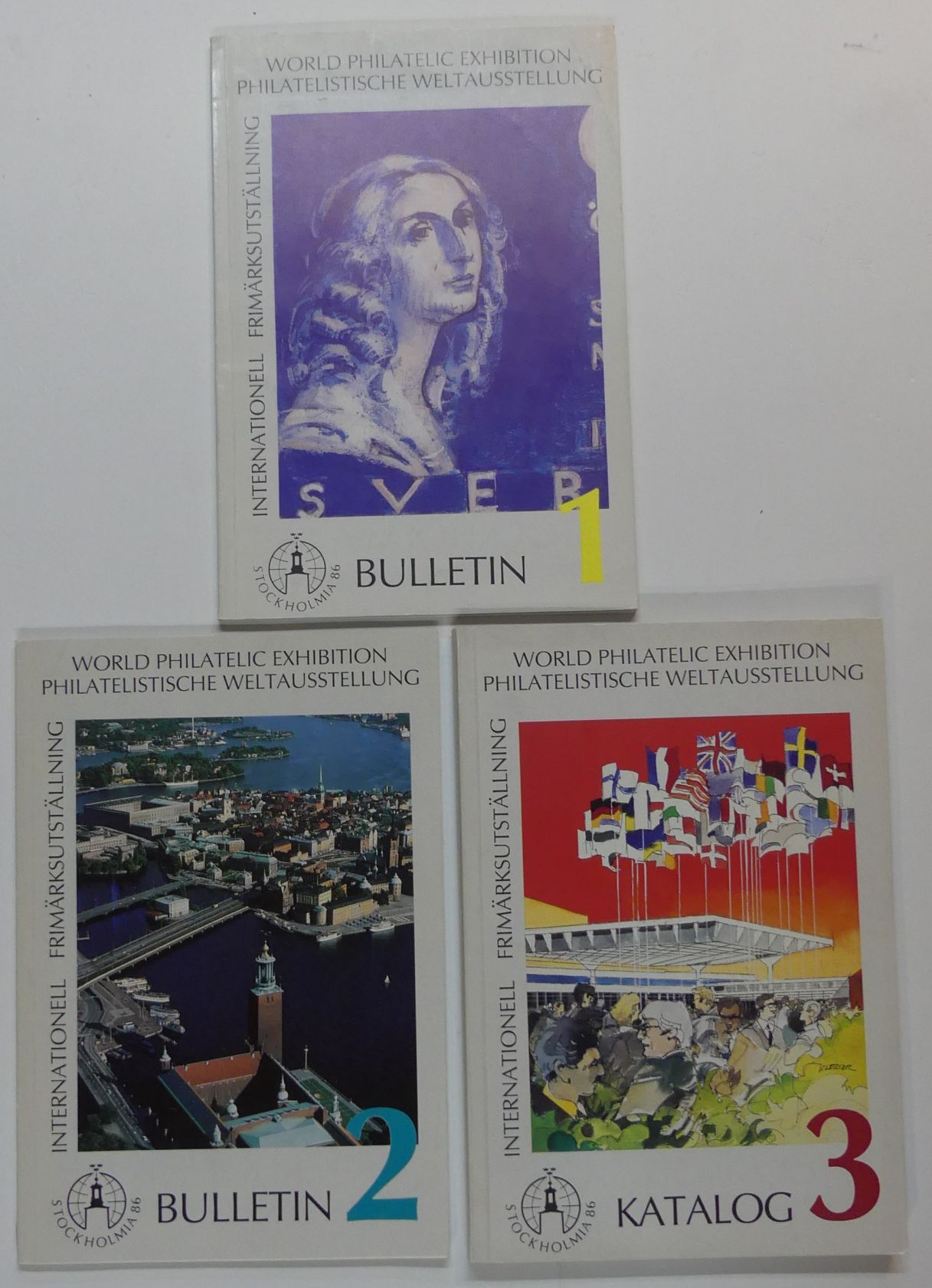 STOCKHOLMIA ’ 86, Bulletin 1, 2 + Katalog inkl. Ganzsachen, 3 Bände, broschiert, sehr gut erhalten