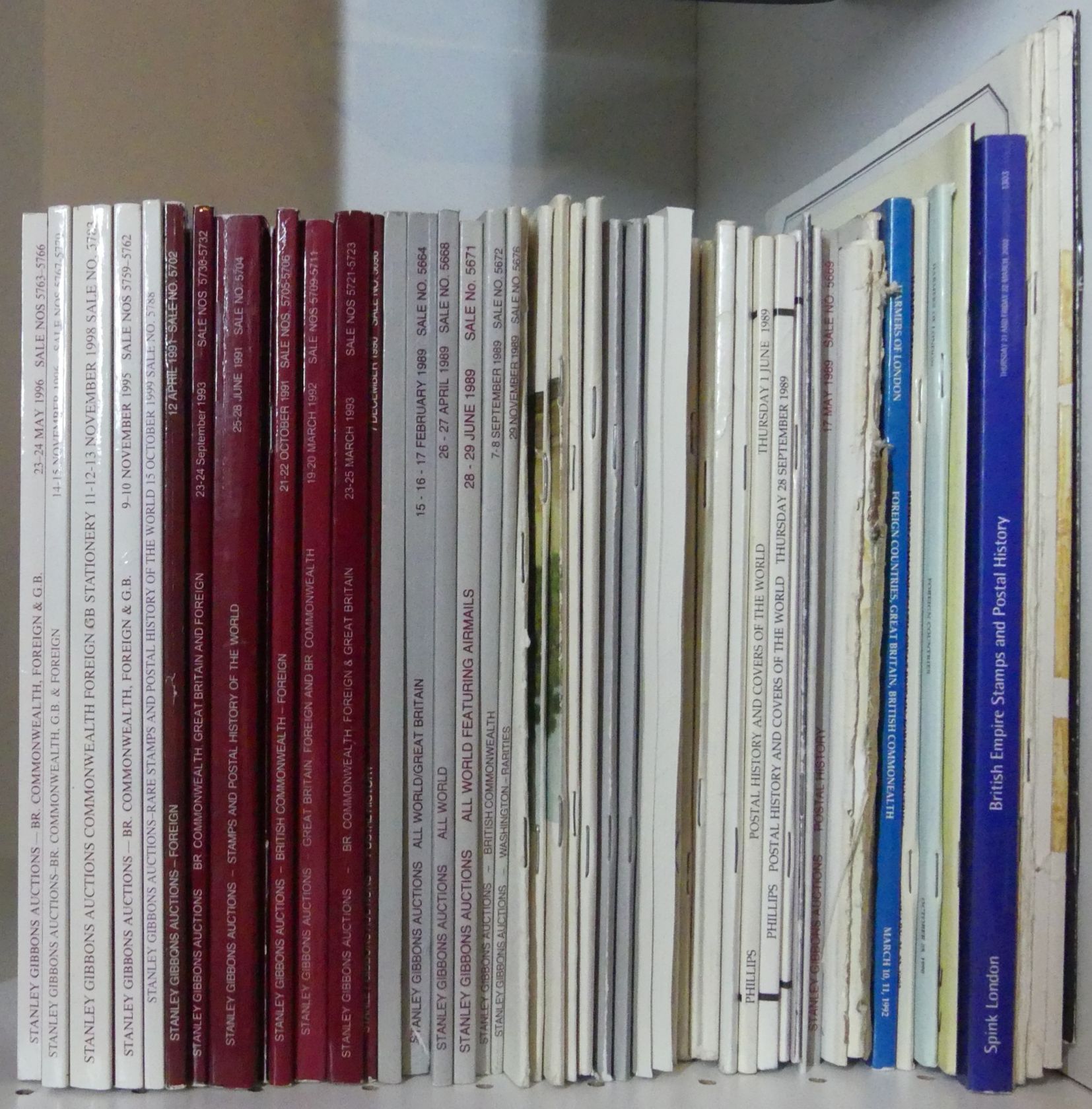 STANLEY GIBBONS (und andere), 1963-1999, 59 Auktionskataloge britischer Auktionshäuser, davon 29 Kataloge der Firma Stanley Gibbons, interessante Sammlungen, teils mit Ergebnislisten, außerdem dabei Robson Lowe, Harmer, Phillips, Rigby Postal History (fünf Stück 1964-1972) usw., gute Erhaltung.