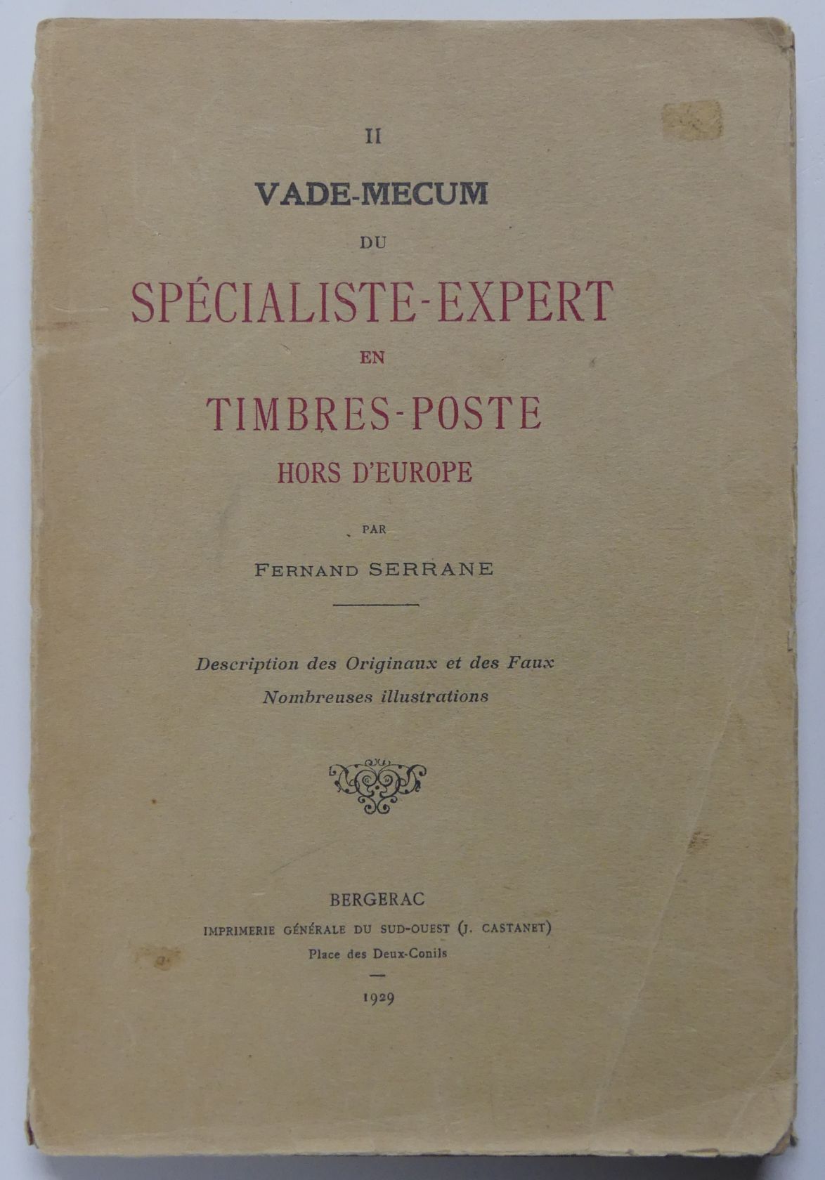 Serrane, Fernand: Il Vade-Mecum du Spécialiste-Expert en Timbres-Poste Hors d’Europe, Bergerac 1929, 318 S., broschiert, Titelblatt lose, sonst gut erhalten