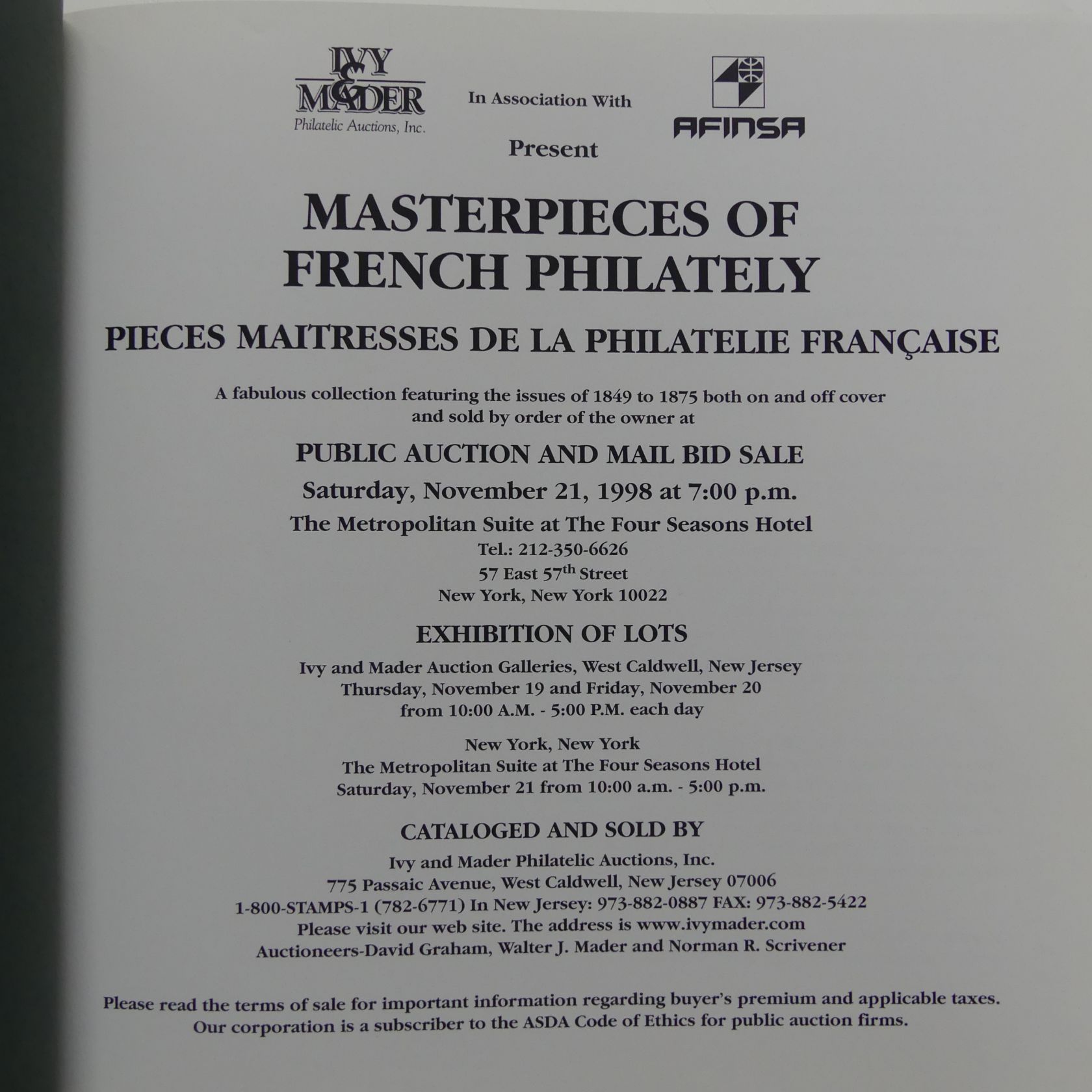 Auktionskatalog Ivy & Mader / AFINSA: Masterpieces of French Philately, New York, 21. Nov. 1998, 316 S., gebunden, sehr gut erhalten