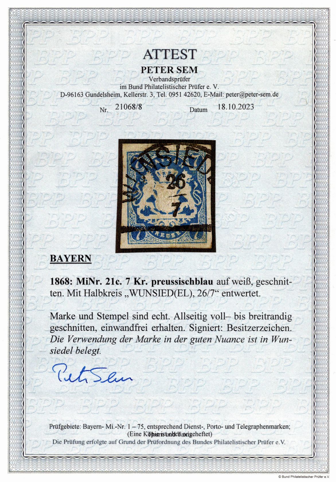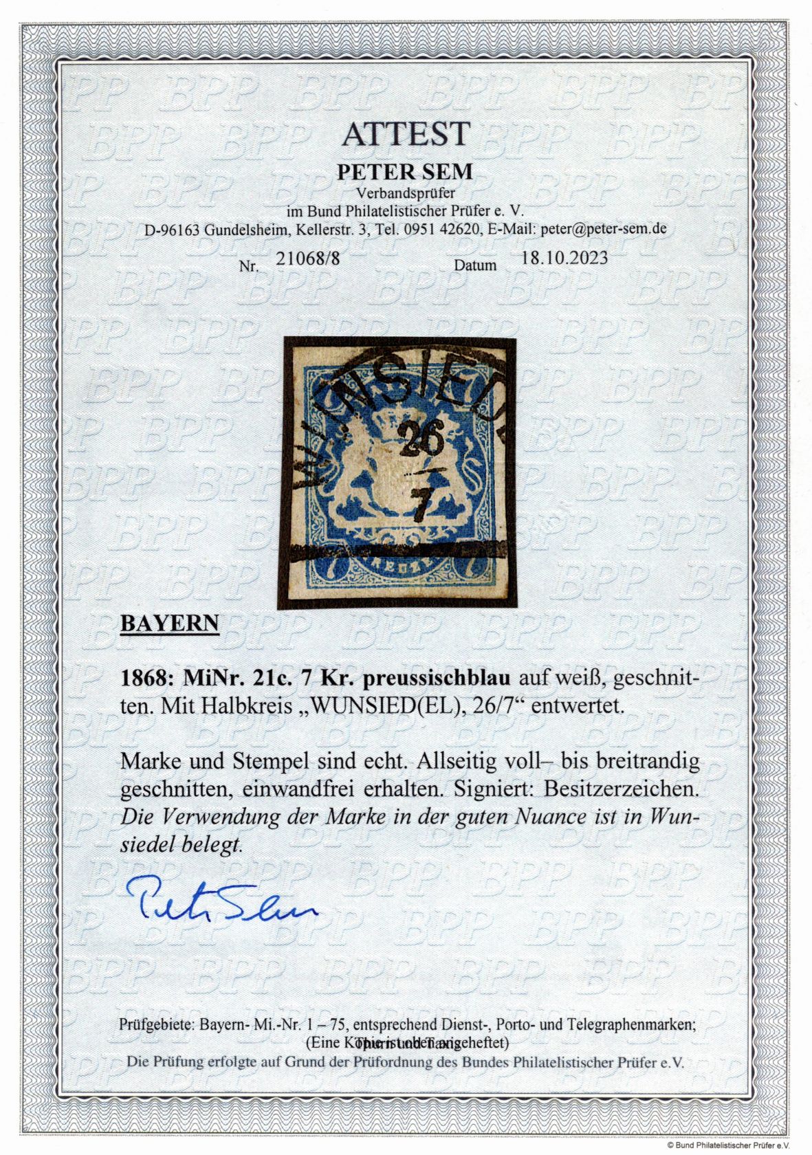1868, Freimarken 7 Kr in preußischblau, Fotoattest 2023 Sem BPP "einwandfrei"