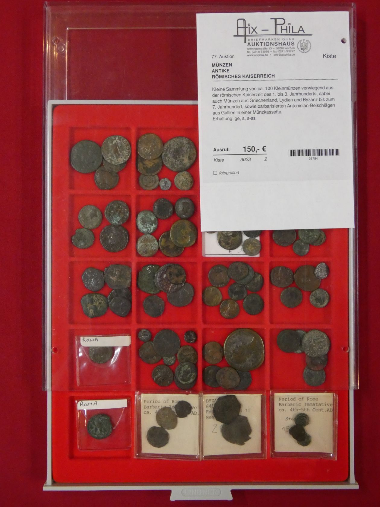 Kleine Sammlung von ca. 100 Kleinmünzen, vorwiegend aus der römischen Kaiserzeit des 1. bis 3. Jahrhunderts, dabei auch Münzen aus Griechenland, Lydien und Byzanz bis zum 7. Jahrhundert sowie barbarisierte Antoninian-Beischläge aus Gallien in einer Münzkassette. Erhaltung: ge, s, s-ss