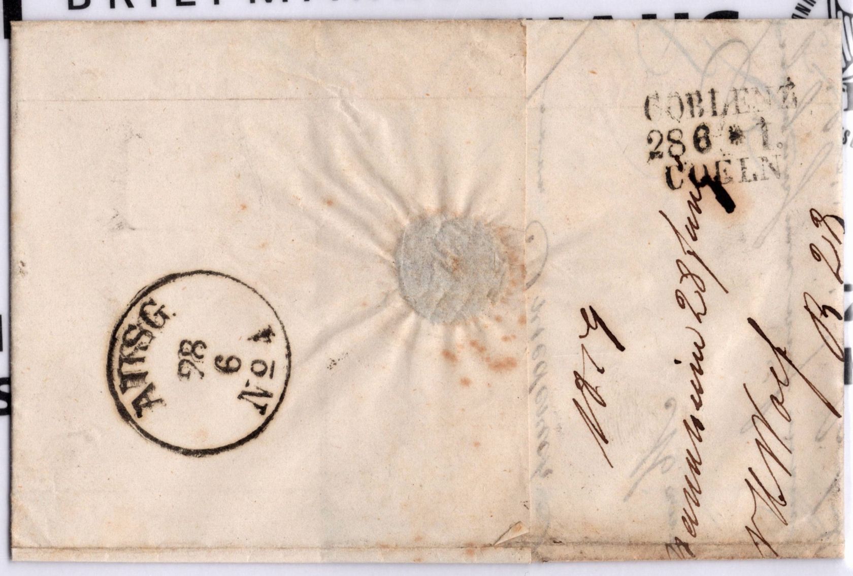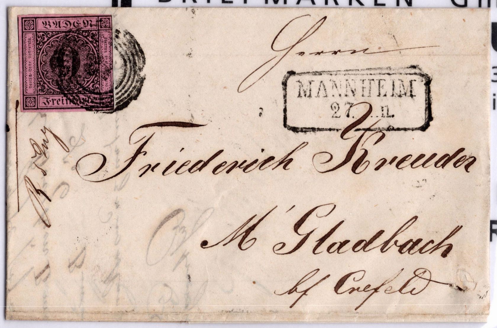 1851, Freimarke 9 Kr auf rötlichkarmin als EF auf Faltbrief von Mannheim mit Fünfringnummernstempel Nr. 87 entwertet nach Mönchengladbach, Marke links berührt, sonst vollrandig