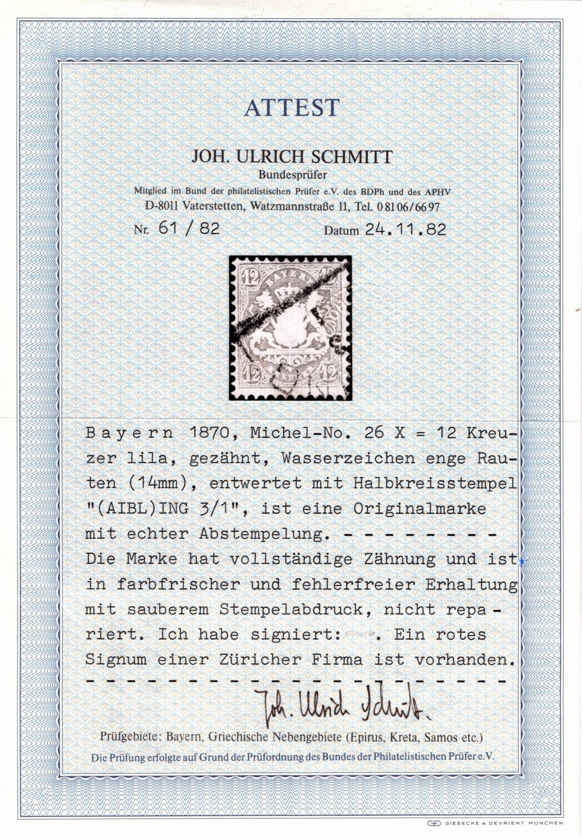 1870, Freimarke 12 Kr. mit Wasserzeichen enge Rauten, Fotoattest Schmitt "fehlerfreie Erhaltung"