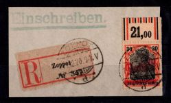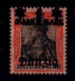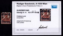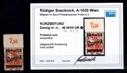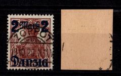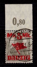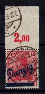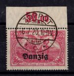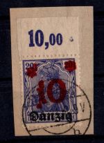 1920, Aushilfsmarken 10 M mit Oberrand im Plattendruck, zeitgerechte Entwertung nicht prüfbar, mit AF-Anstrich des z in Danzig gebrochen, Kurzbefund 2018 Soecknick BPP "einwandfrei"