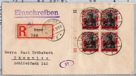 1920, kleiner Innendienst 40 Pf in lilarot im Viererblock auf portorichtigem sogn. Trübsbach-Brief von Zoppot nach Chemnitz. Fotoattest 2020 Bock BPP "einwandfrei"