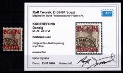 1920, Aushilfsmarken 1 1/4 M, zeitgerechte Entwertung nicht prüfbar, mit AF D von Danzig eingebuchtet, Kurzbefund 2018 Soecknick BPP "einwandfrei"