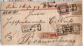 1872, kleines Brustschild 1/4 Gr und 3x 5 Gr auf Paketbegleitbrief mit zweizeiligem Sachsen-Rahmenstempel DRESDEN III 20 IX 72 * 1-2N, 1/4 Gr-Marke mit Plattenfehler "Zwei helle Punkte im unteren Rahmen", die li. 5 Gr-Marke hat einen Eckfehler, ansonsten sind die Marken übliche gezähnte und einwandfreie Erhaltung. Der Paketbegleitbrief ist nicht ganz vollständig und fehlerhaft, Paketzettel li. abgerissen, richtig frankiert, rückseitiger Ankunftsstempel, Fotoattest Krug BPP