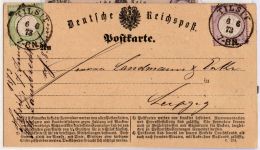 1872, kleines Brustschild 1/4 Gr und großes Brustschild 1/3 gelblichgrün mit Preußen DKr. TILSIT 6 6 73 7-8N auf amtlichem Postkartenformular nach Leipzig, beide Marken sind farbfrisch, gut geprägt, gut gezähnt und in einwandfreier Erhaltung, Postkarte etwas gekürzt und leicht überfrankiert, Fotobefund Krug BPP