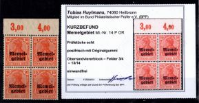1923, Freimarken 2 C im Eckrandviererblock, wobei die linke untere Marke den PF I in Klaipeda beschädigt aufweist. Fotoattest 2022 Huylmans BPP "einwandfrei"