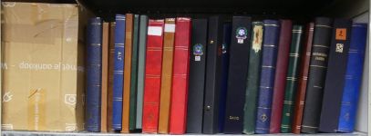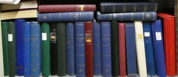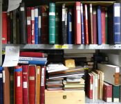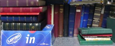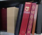 Vollgestopftes Regalfach mit etlichen Steckbüchern aus aller Welt. Es ist kaum Deutschland dabei, dafür aber viel Belgien, die Niederlande und weiteres Ausland. Von Steckkartenposten bis zu besseren Einzelwerten und Belegen ist alles dabei.